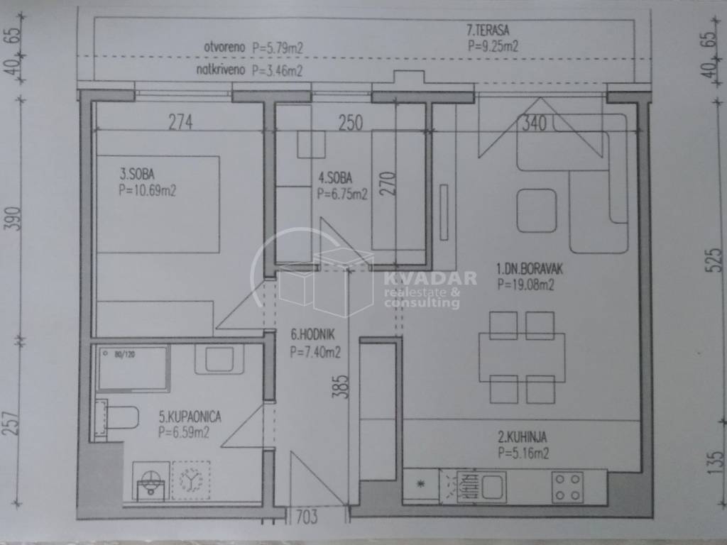 Na 7. katu (od ukupno 7) stambene zgrade s liftom nalazi se svijetao i prozračan trosobni stan s 55,67 m2 stambenog prostora, idealan za život ili najam. Raspored prostorija izuzetno je praktičan: ulazni hodnik, dnevni boravak s kuhinjom i izlazom na terasu od 9,25 m2 (dijelom natkrivenu), dvije spavaće sobe te kupaonica.