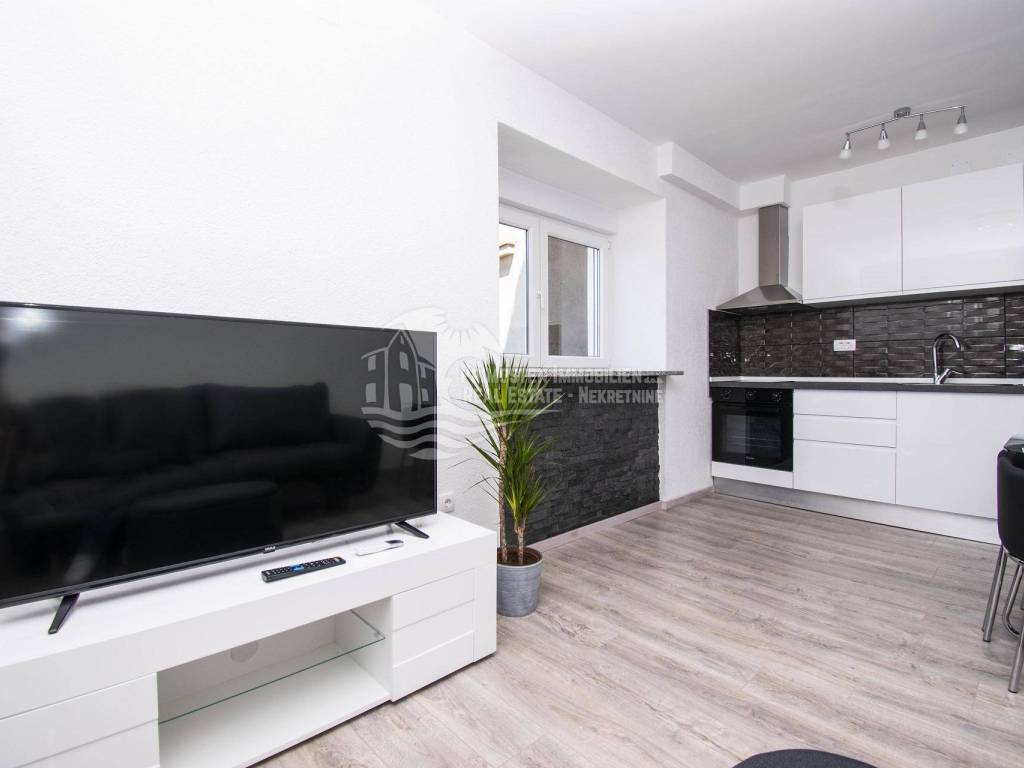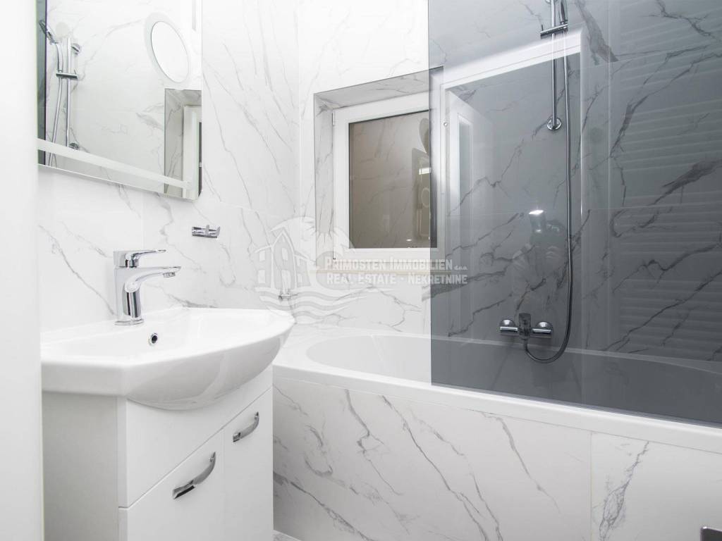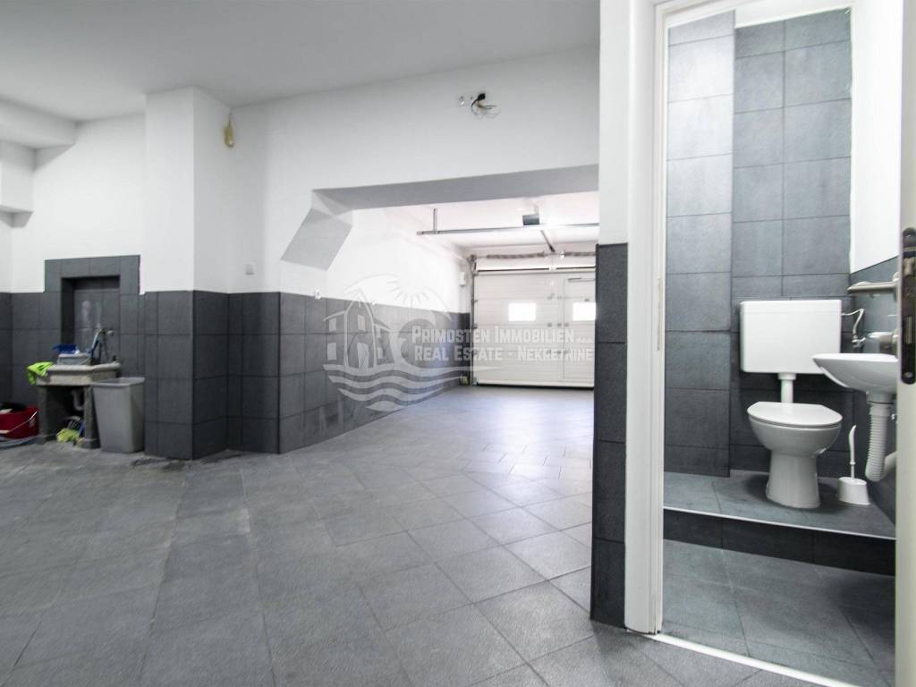 Prodaje se moderna renovirana kuća u Šibeniku, površine 214 m² te je izgrađena na parceli 111 m². Sastoji se od prizemlja i dva kata. U prizemlju se nalaze dva ulaza od kojih je jedan ulaz za garažu od 45 m², a drugi obuhvaća ulazni prostor i kupaonicu. Sa prizemlja se stubištem dolazi na prvi kat na kojem se nalazi spavaća soba sa kupaonicom, hodnik te spremište. Također u sklopu se nalazi još i unutarnje stubište za drugi kat na kojem se nalaze dnevni boravak, kuhinja, blagovaonica, spavaća soba i kupaonica. Sa ove etaže se pruža lijepi pogled na more i grad te je lijepo prostrano raspoređena. Površina stana je 90 m². Na prizemlju se nalazi još i drugi ulaz preko kojeg se dolazi u dvoetažni stan od 50 m², a koji se sastoji od hodnika, dnevnog boravka, kuhinje i spavaće sobe na katu, te kupaonice i hodnika na prizemlju. Stubište spaja prizemlje i prvi kat. Stanu još pripada i nenatkrivena terasa od 16 m². Nadalje na prvom katu se nalazi stubište koje vodi na prostranu krovnu terasu od 65 m² koja uključuje garnituru za sjedenje i jacuzzi. Sa terase se pruža fantastičan panoramski pogled na more i grad Šibenik. Kuća je nedavno renovirana, klimatizirana, ima modernu tehničku opremu te se prodaje sa namještajem. Također još su uključena i dva dodatna parkirna mjesta. Udaljenost od mora i centra grada je oko 500 m.