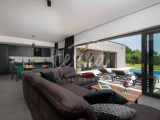 Velike osunčane staklene stijene pružaju pogled na prostrani bazen sa sunčalištem i lijepo uređenu okućnicu