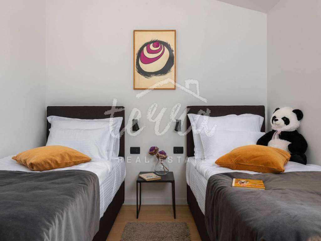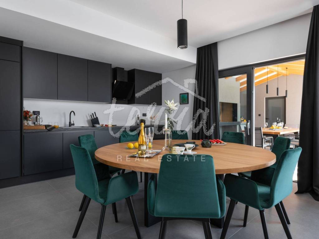 U prizemlju se nalazi prostrana kuhinja,blagavaona i dnevni boravak otvorenog tipa,jedna spavaća soba,dva toaleta te sauna.