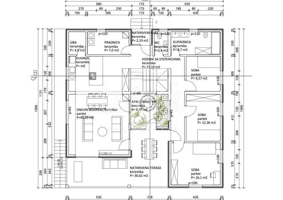 Kuća je okružena zelenilom te i sama konfiguracija terena ne dozvoljava nikakvu gradnju na susjednim terenima što omogućuje potpunu privatnost i mir.