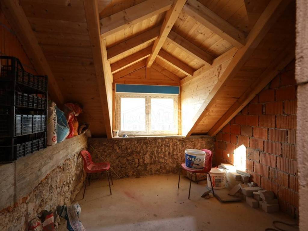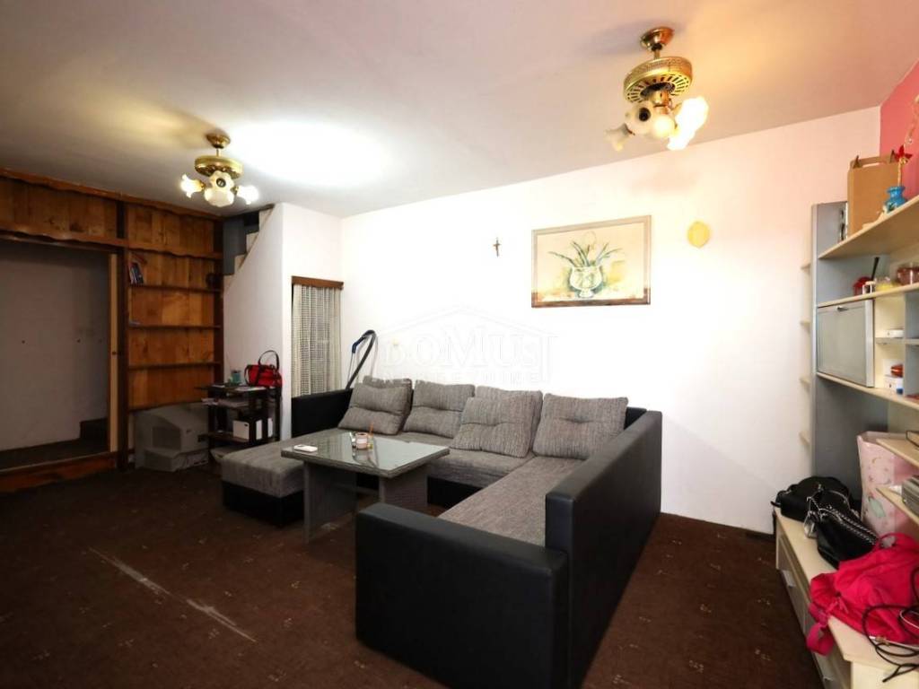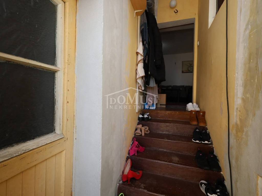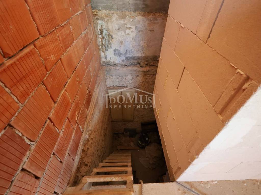 U širem centru grada, samo 230m do mora i šetnice, smješten je dvoetažni stan ukupne korisne površine 117,46m2 i rasporedom je podijeljen u dva dvoetažna stana. Dvosoban dvoetažni stan korisne površine 84,29m2 koji na prvom katu se sastoji od stepeništa, hodnika, velikog dnevnog boravka, kuhinje sa blagovaonom s pogledom na more, wc-a, a unutarnje stepenice vode na 2. kat gdje se nalazi predsoblje sa hodnikom, kupaona, te dvije spavaće sobe koje imaju izlaz na prostranu terasu 22,99m2 (dijelom natkrivenu) sa koje se pruža prekrasan panoramski pogled na more i grad. Stan je useljiv i namješten, ali traži adaptaciju. Drugi dvoetažni jednosobni stan površine 30,83m2 je u roh bau i nije useljiv. Na 1. katu je prostorija u kojoj je predviđena kuhinja sa dnevnim boravkom, te unutarnje stepenice (koje nisu postavljene) za visoko potkrovlje gdje je predviđena kupaona i spavaća soba s pogledom na more. Nekretnina se nalazi u pješačkoj zoni i nema prilaz autom, a parking na javnoj površini udaljen 200m. Udaljenost do plaže Banj je 550 m, a do centra 750 m.