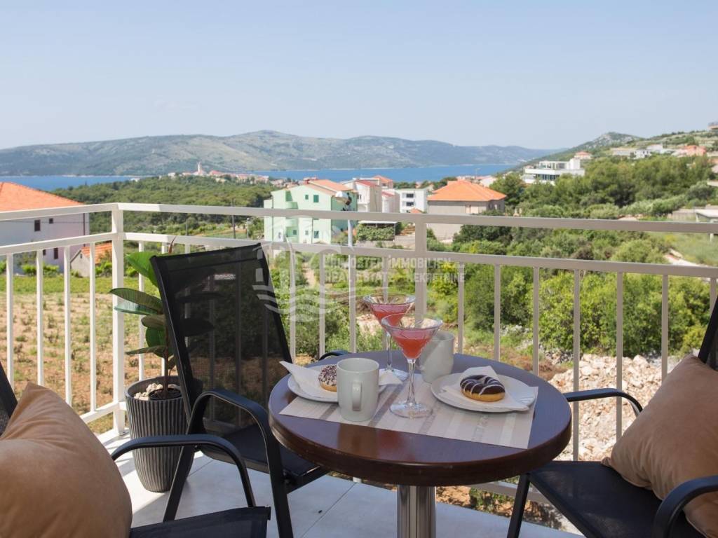 Prva etaža: Apartman površine cca 85 m², kompletno namješten i uređen. Sastoji se od dvije spavaće sobe, kupaonice, hodnika, kuhinje s blagovaonicom, prostranog dnevnog boravka i velike terase s panoramskim pogledom na more.