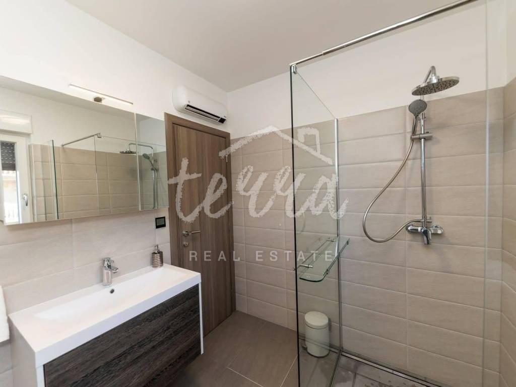 – 1. etaža: hodnik, kuhinja i blagovaonica, spavaća soba (krevet 160×200), kupaonica, terasa s pogledom na more.
