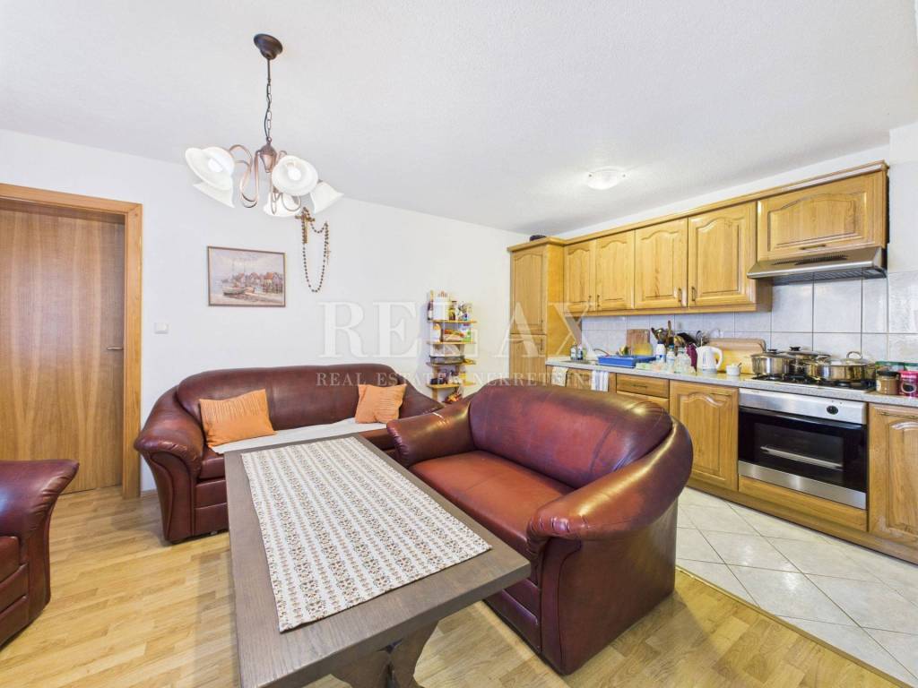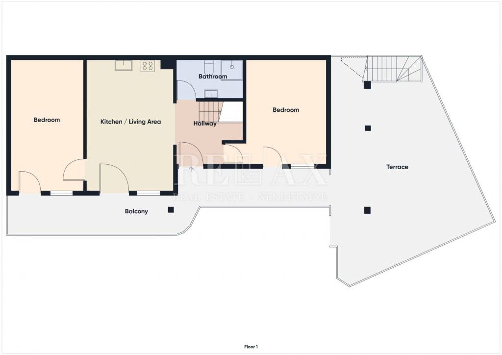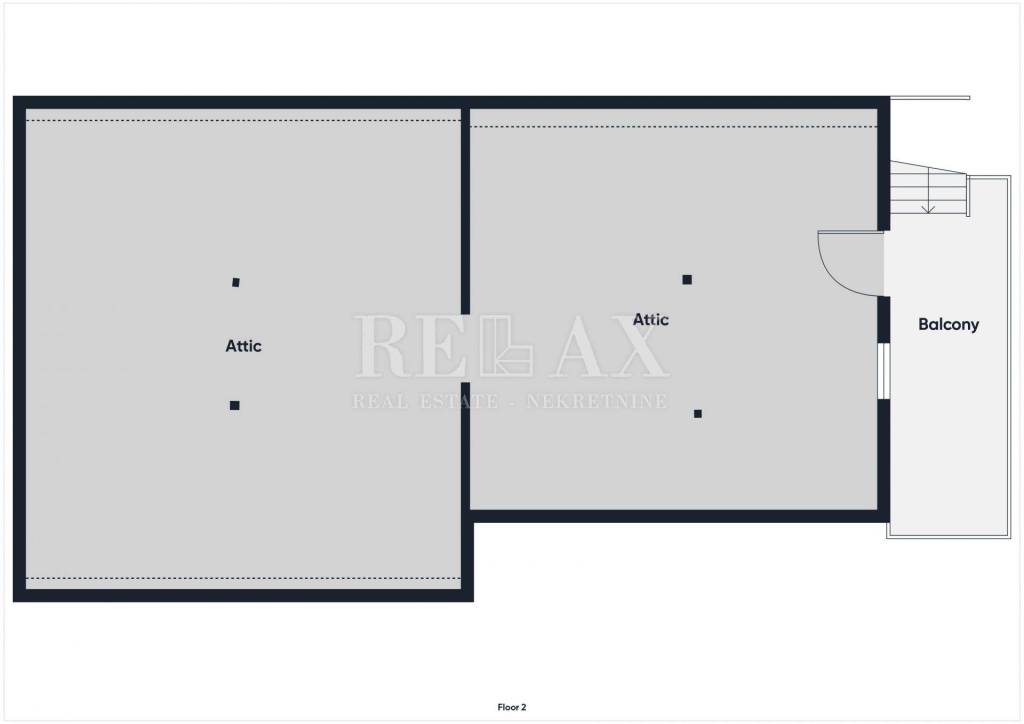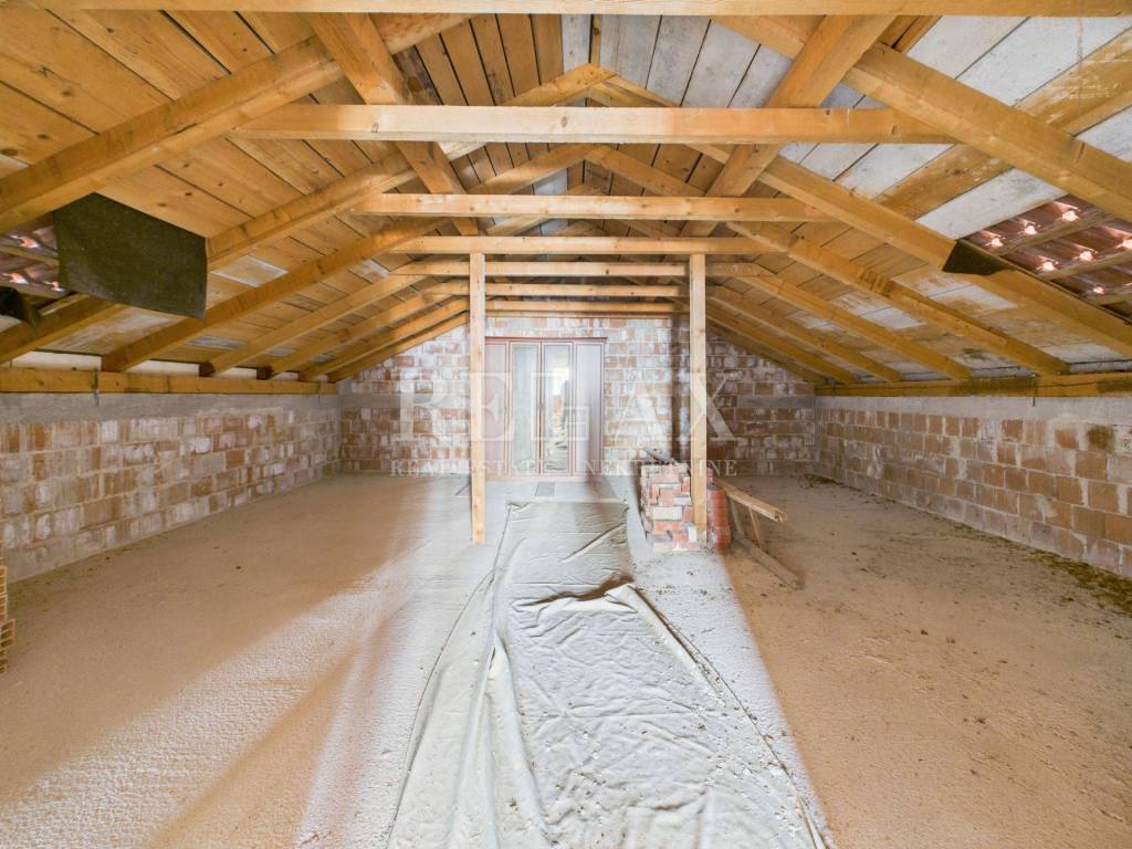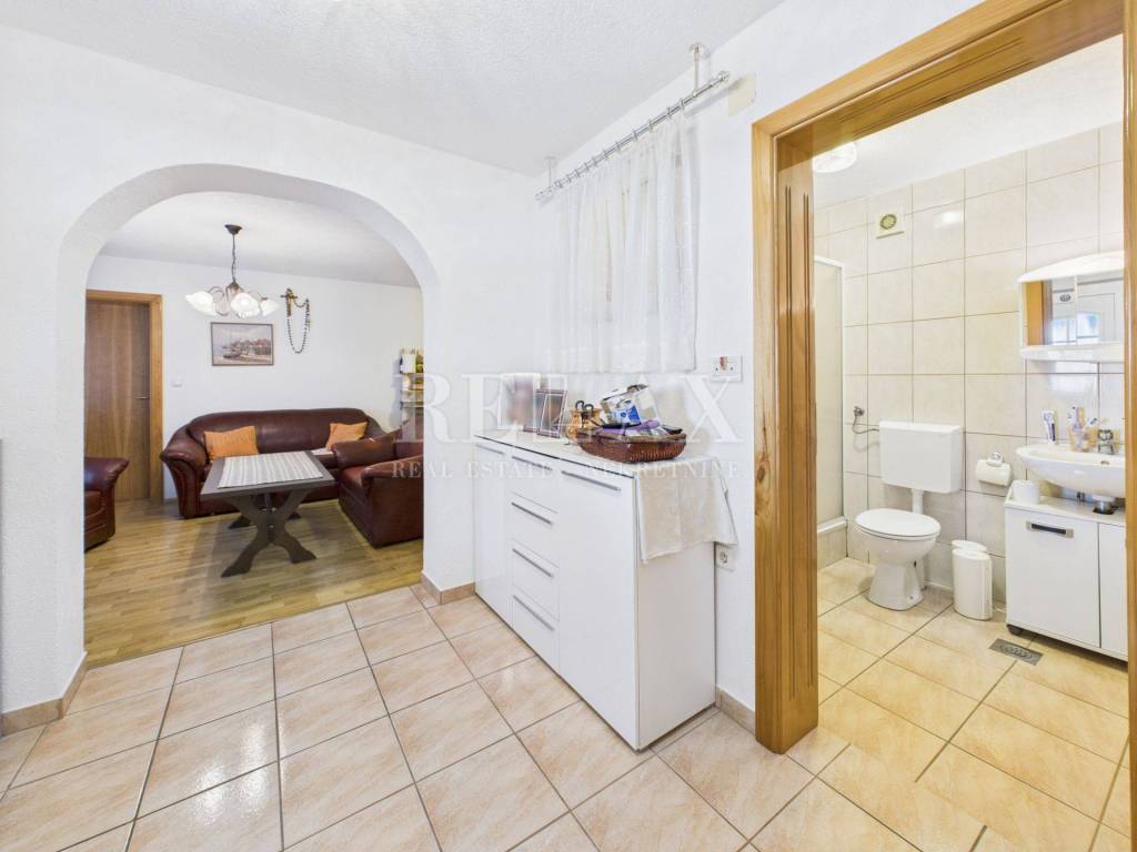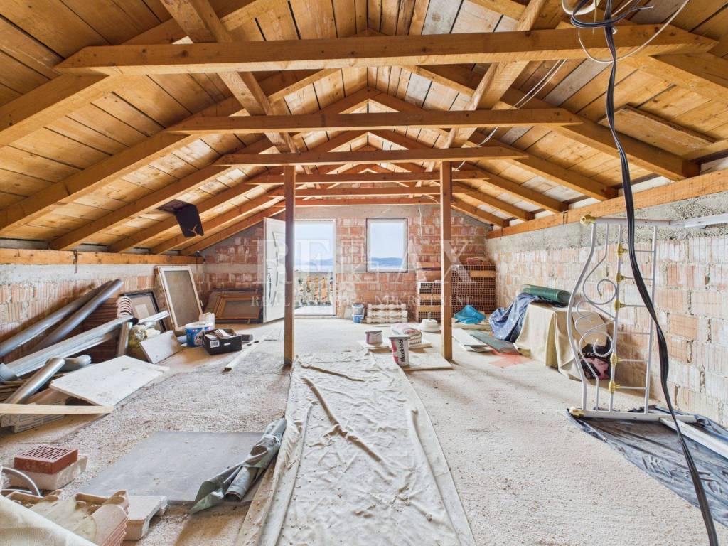 Kuća se sastoji od prizemlja, prvog kata i potkrovlja. Prizemlje i prvi kat su uređeni dvosobni stanovi, svaki površine 61 m², s vlastitom kuhinjm, dnevnim boravkom, kupaonicom i terasom. Potkrovlje površine 88 m² nalazi se u roh bau fazi, s balkonom s kojeg se pruža panoramski pogled na more i okolicu. Ta etaža nudi mogućnost uređenja dodatne stambene jedinice po vlastitim željama, čime se značajno povećava potencijal ove kuće kao investicije.