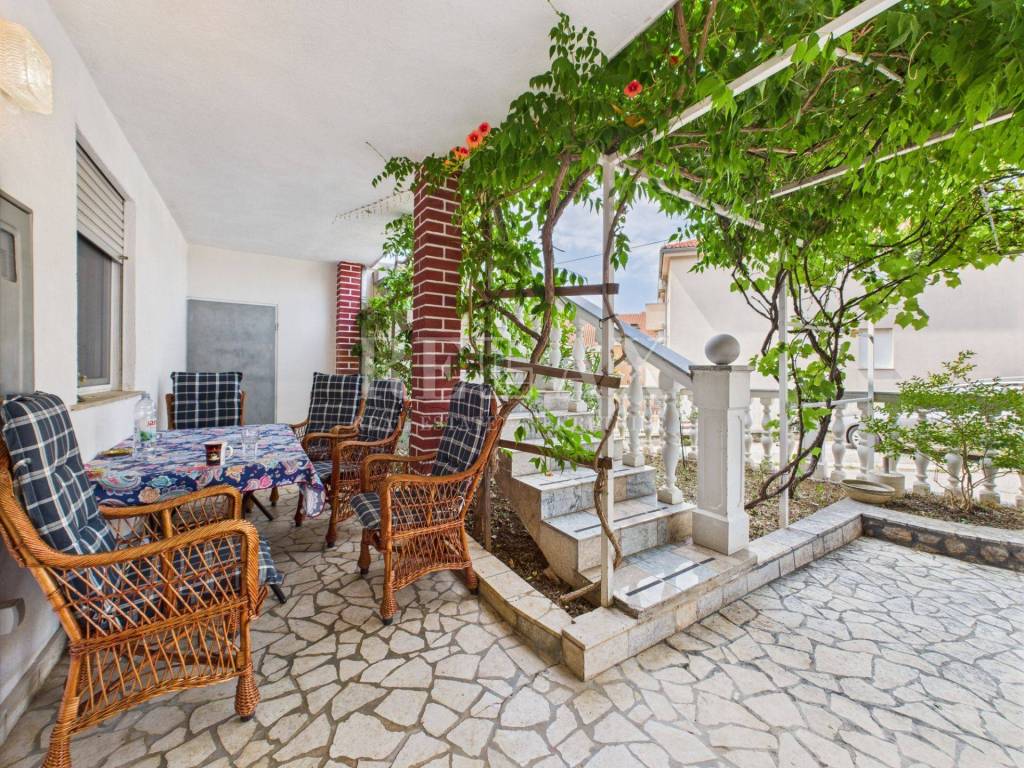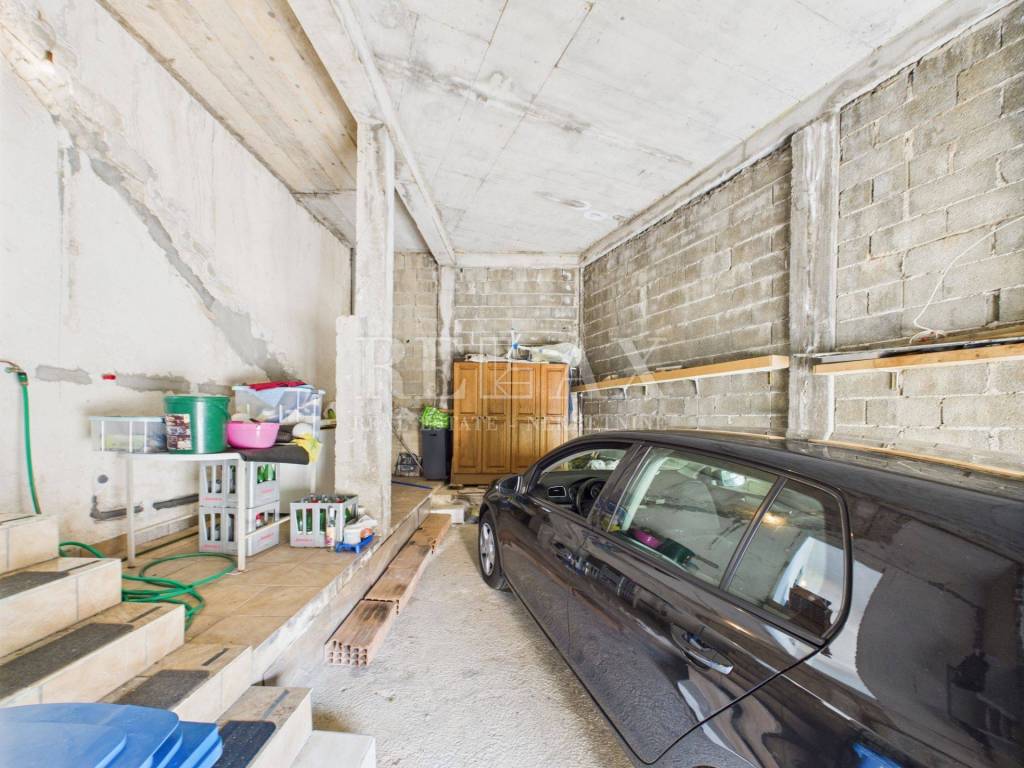 Kuća ima tri parkirna mjesta – jedno u garaži i dva unutar ograđene okućnice. Okućnica je uređena i popločana, s natkrivenim dijelovima za sjedenje, zelenilom i mediteranskim biljem, stvarajući ugodan vanjski prostor za boravak. Objekt je opremljen klima uređajima, a prizemlje i prvi kat su useljivi.