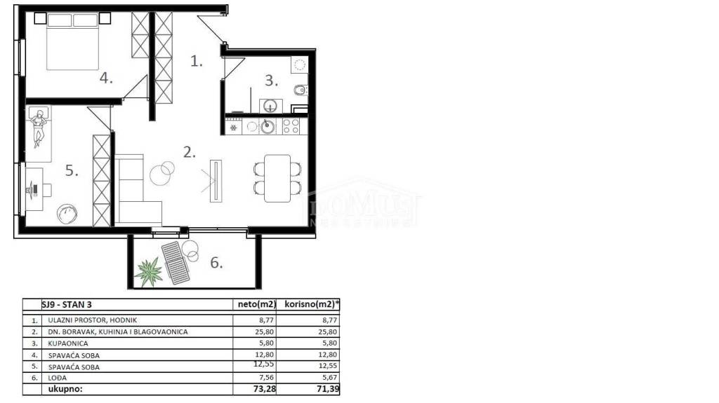 Stan SJ9 nalazi se na prvom katu zgrade, ukupne korisne površine 71,39 m², te se sastoji od ulaznog hodnika, kupaonice, dvije spavaće sobe, kuhinje i dnevnog boravka s izlazom na lođu od 7,56 m². Stan je modernog dizajna i funkcionalnog rasporeda, opremljen klima uređajima u svim spavaćim sobama i dnevnom boravku, protuprovalnim ulaznim vratima, PVC stolarijom te modernom kupaonskom opremom. Uz stan dolaze dvije garaže.