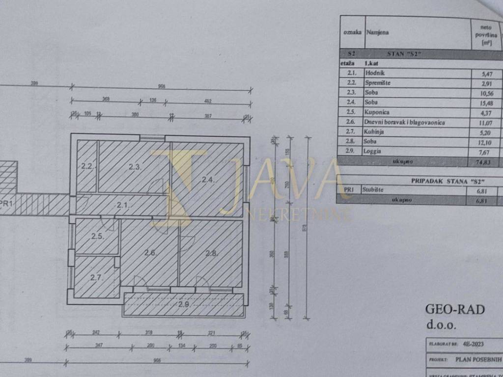 Stan 74,83 m²: hodnik, kuhinja, dnevni boravak s blagovaonom, tri sobe, kupaonica, spremište i loggia južne orijentacije s otvorenim pogledom