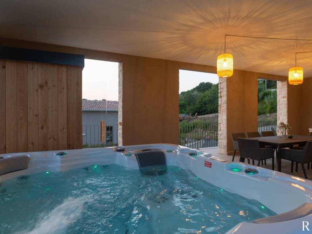 Bazen je veličine 55,20mq sa pozicijom na donjoj kaskadi zemljišta, dostupan stepenicama. Uz bazen se nalazi i sunčalište.