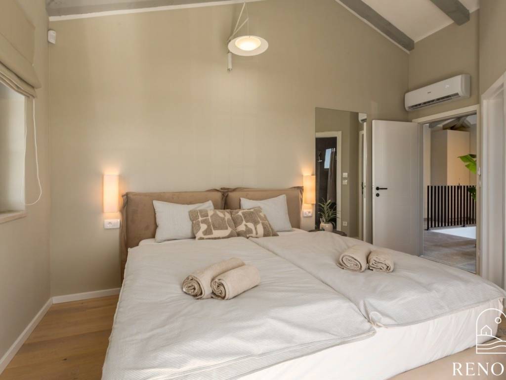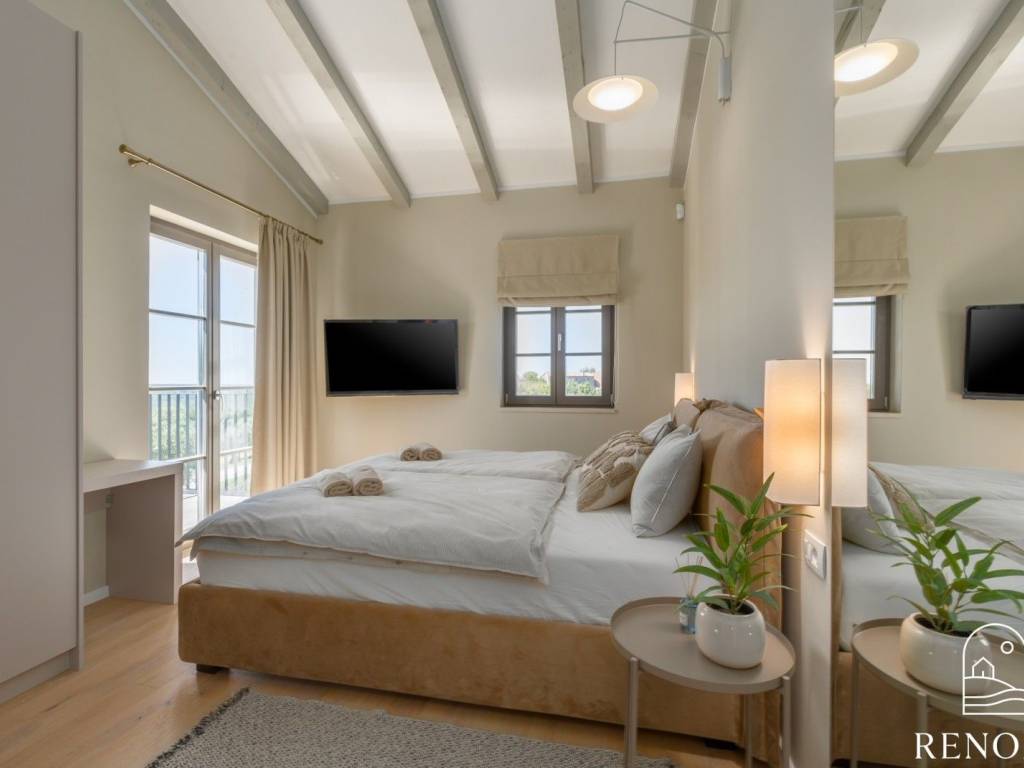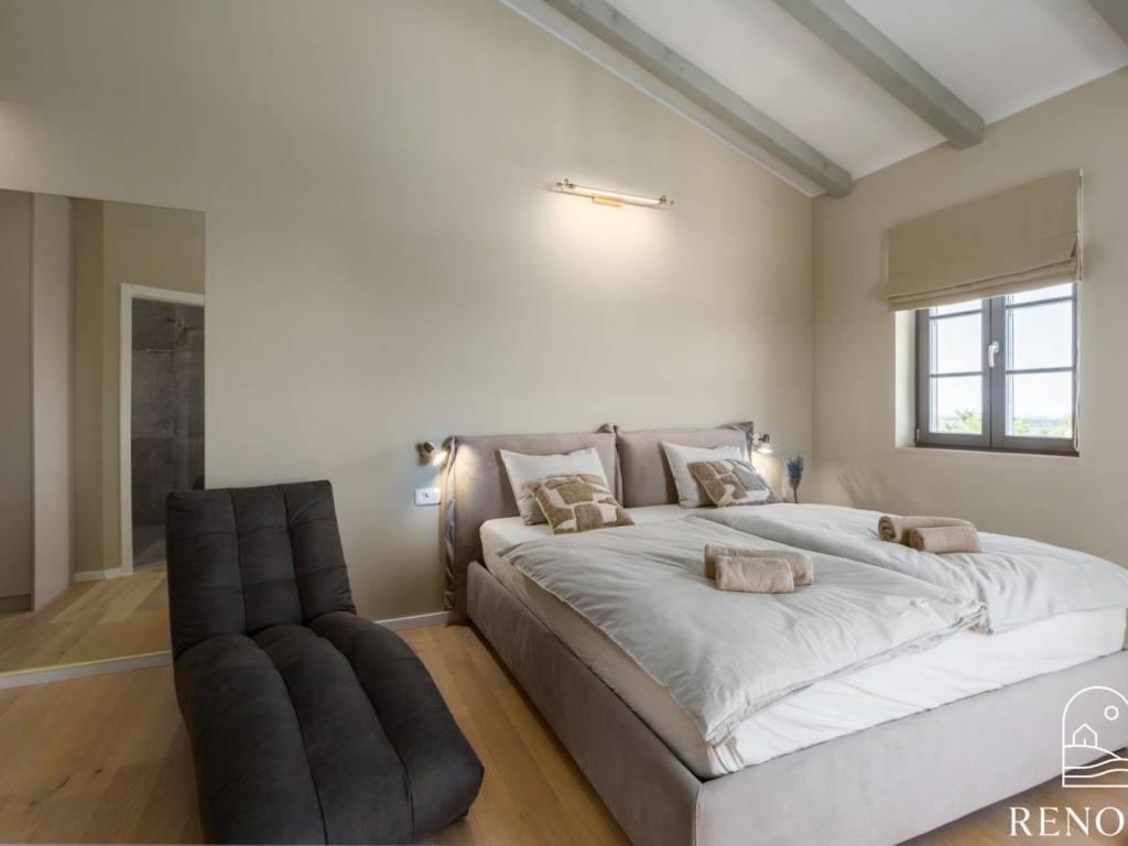 Na katu su se smjestile ostale spavaće sobe, svaka sa svojom kupaonicom, od kojih master soba ima izlaz na prekrasnu terasu sa koje se pruža pogled na istarske maslinike i vinograde.