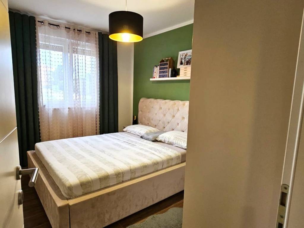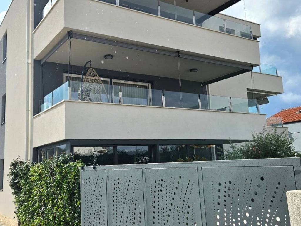 Prodaje se elegantan stan na 1. katu zgrade površine 82,02 m2. Sastoji se od ulaznog hodnika, izbe, 2 spavaće sobe, kupaonice, dnevnog boravka sa kuhinjom i blagovaonicom u "open space" izvedbi. Iz dnevnog boravka se kroz veliku staklenu stijenu izlazi na prostranu natkrivenu terasu sa koje se pruža lijepi pogled na more. Grijanje/hlađenje putem klima uređaja, u kupaonici je podno električno grijanje! Stan ima postavljenu tendu na terasi i komarnike! Pripada mu jedno parkirno mjesto i prodaje se kompletno opremljen!