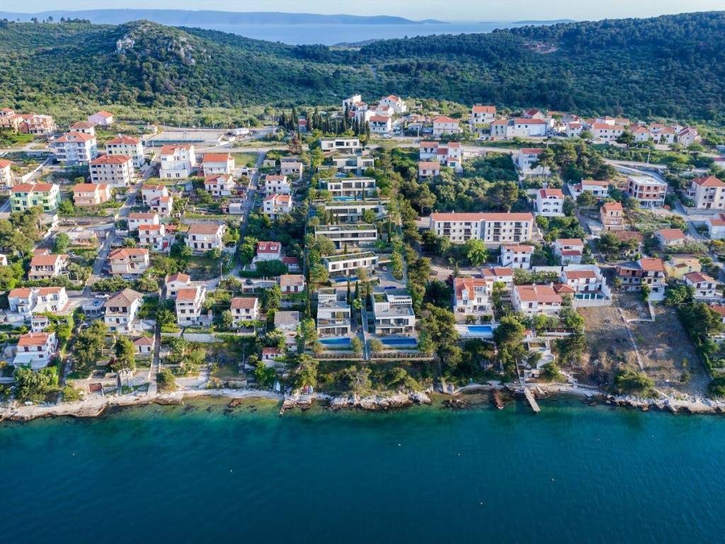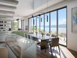 I prizemlje i gornji kat otvaraju cijelu dužinu zgrade prema sunčanoj terasi s bazenom. U prizemlju, u razini grijanog bazena, možete uživati u otvorenom dnevnom boravku i blagovaonici s potpuno opremljenom kuhinjom na površini od 76m2.
