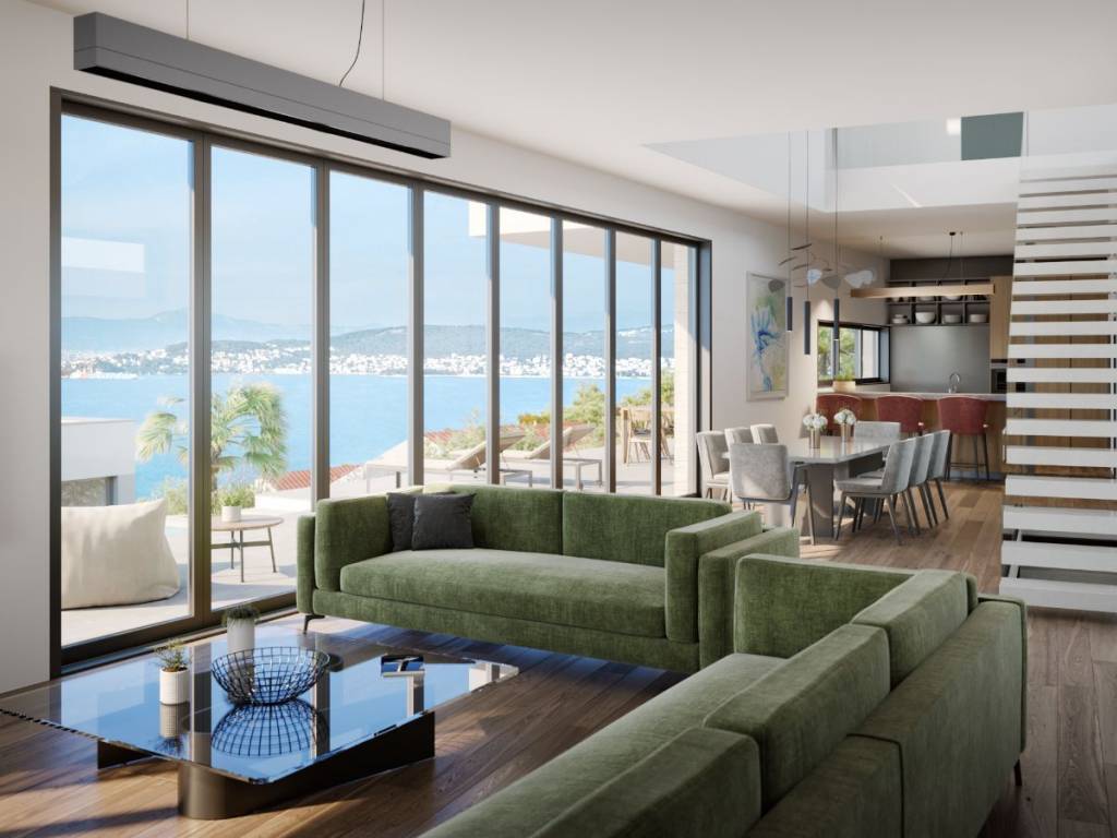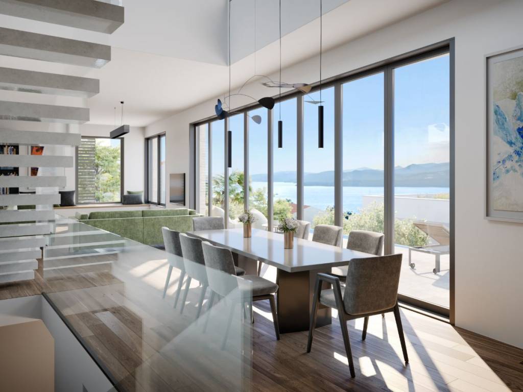 U prizemlju, na razini grijanog bazena, možete uživati u otvorenom dnevnom boravku i blagovaonici uključujući potpuno opremljenu kuhinju na površini od 76m2.