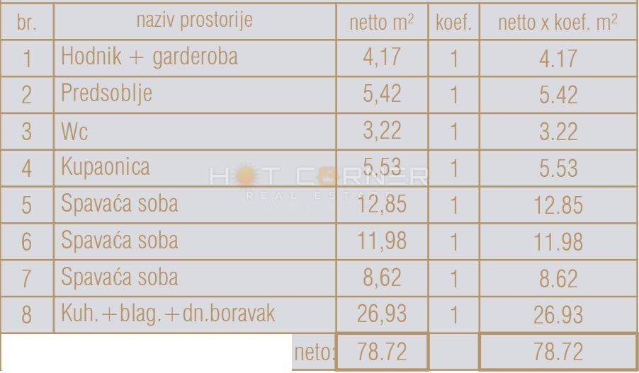 Stan se sastoji od: ulaznog hodnika, i garderobe, svijetlim dnevnim boravkom u open space konceptu s kuhinjom i blagovaonicom, te s tri spavaće sobe i dvije kupaonice. Protuprovalna vrata osiguravaju sigurnost, dok klima uređaji i električno podno grijanje u kupaoni brinu za ugodnu temperaturu kroz cijelu godinu.