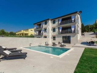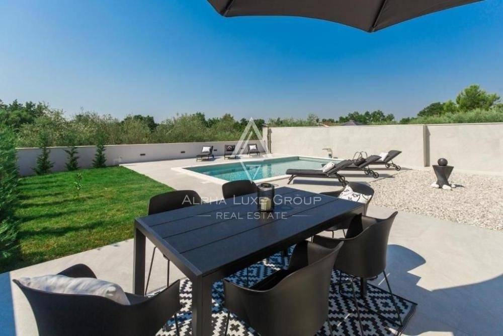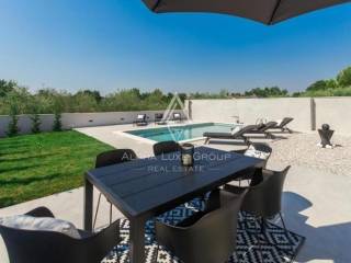 Ova atraktivna moderna vila s bazenom se nalazi na kraju sela u mirnom okruženju, samo 7 km od centra i 5,5 km od plaže. Kuća je veličine 240 m2 sadrži dvije etaže i suteren, na okućnici od 476 m2.