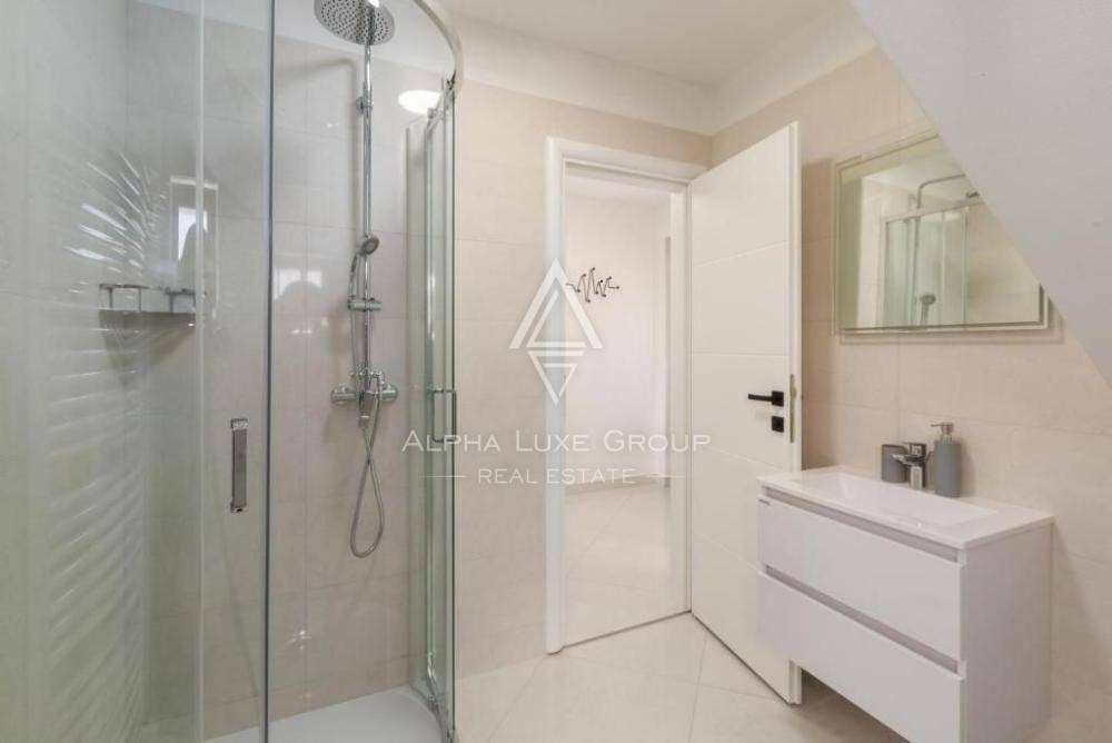 U prizemlju su dostupni prostrani dnevni boravak, kuhinja, blagovaonica, jednosobna soba i kupaonica. Terasa ima prekrasan pogled na more, bazen i prirodu.