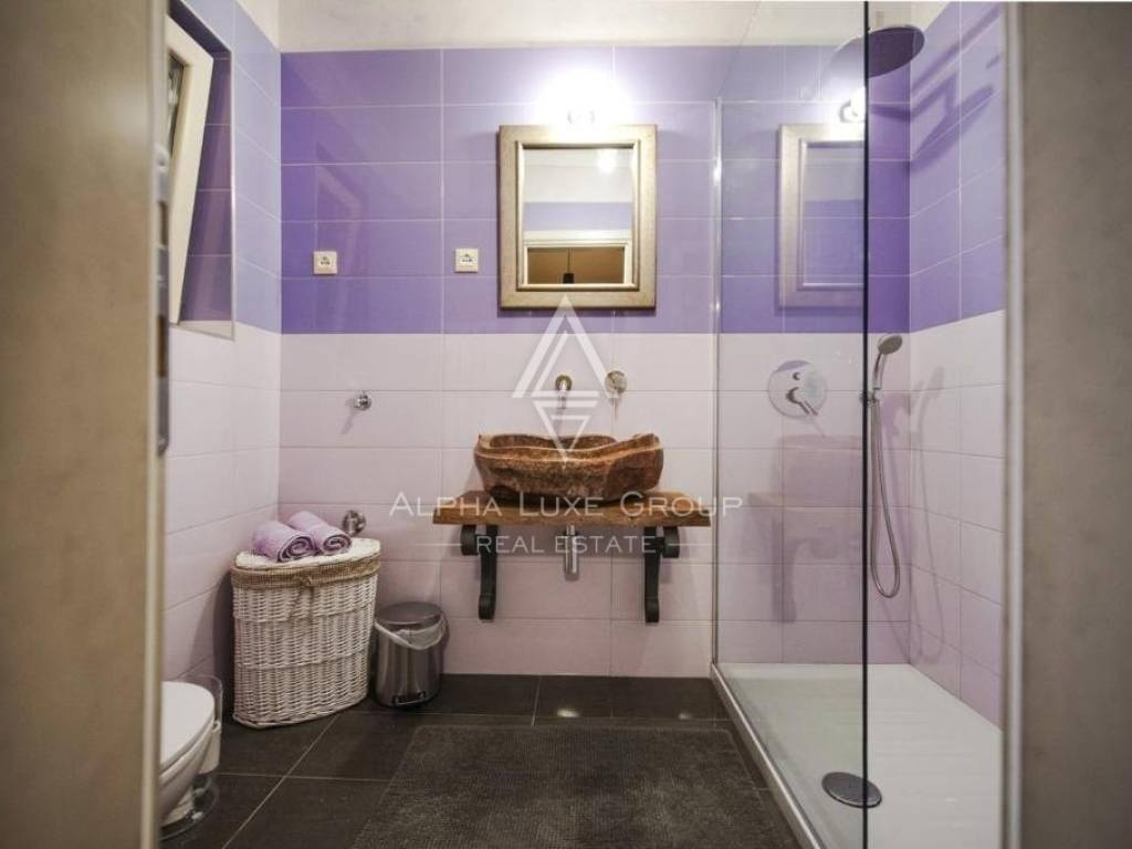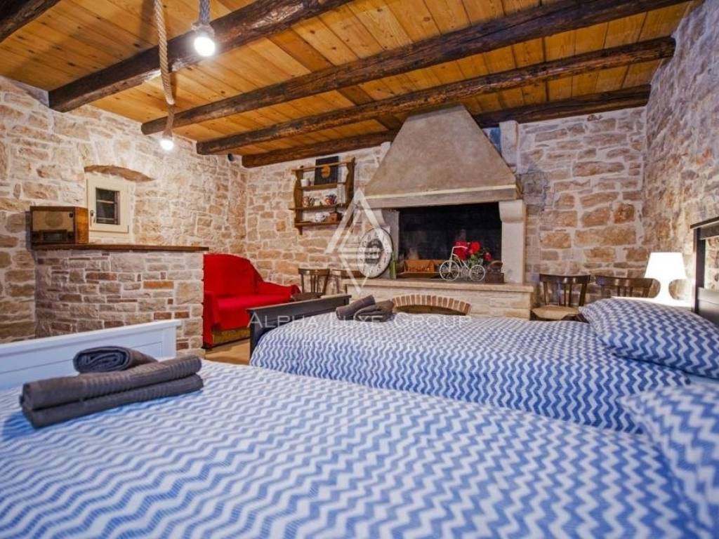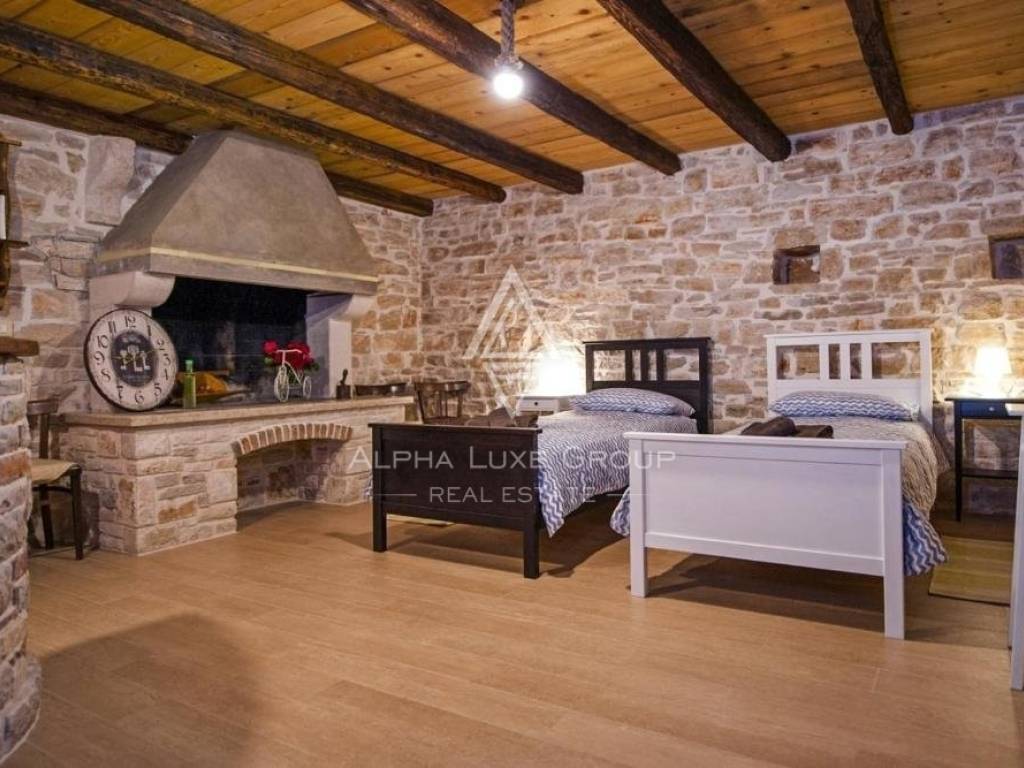 Može primiti do 12 osoba i uključuje četiri spavaće sobe i pet kupaonica. Veliki dnevni boravak sa starinskim namještajem i drvenim gredama pruža miran i ugodan osjećaj u prizemlju vile.