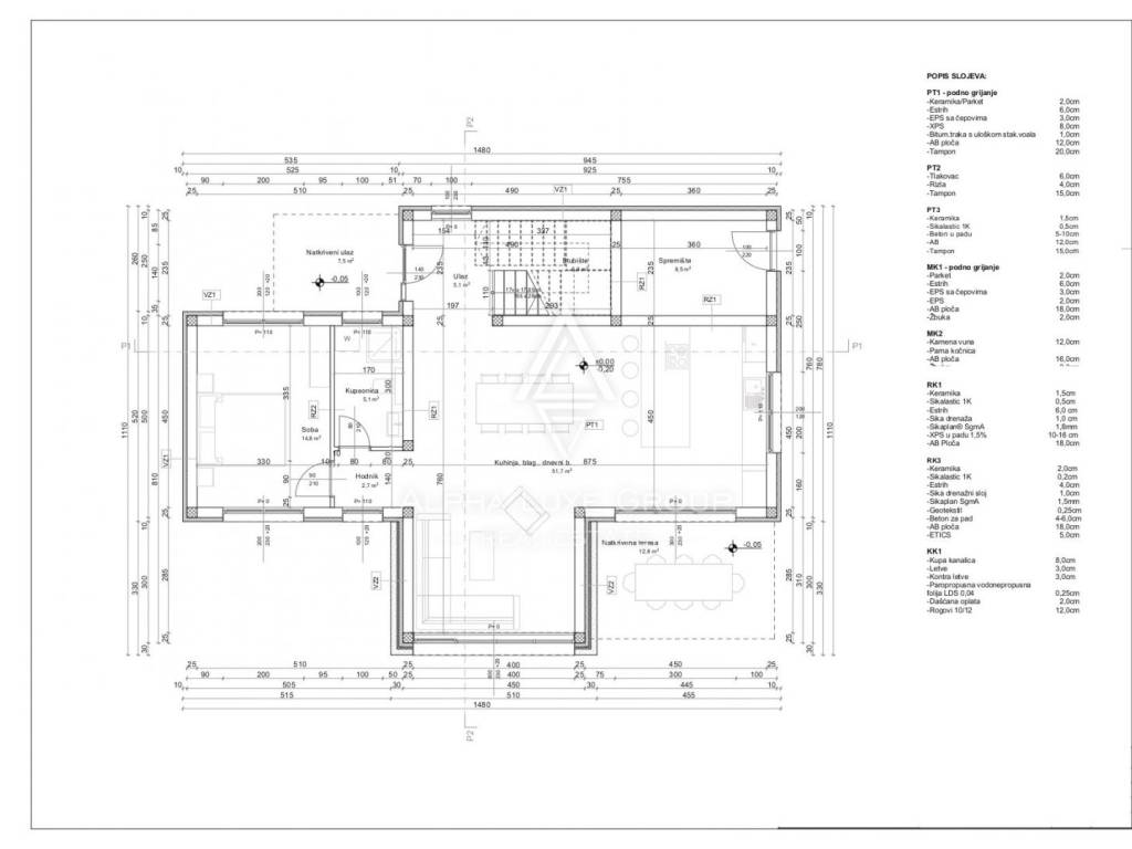 U prizemlju se nalazi prostrani dnevni boravak povezan s kuhinjom i blagovaonicom, a staklene stijene povezuju interijer s natkrivenom terasom, ljetnom kuhinjom i bazenom. Prizemlje uključuje i spavaću sobu, kupaonicu i spremište.