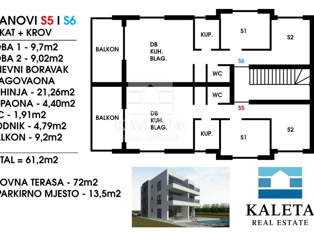 Stanovi S5 i S6, svaki površine 62,2 m² + krovna terasa 72 m² + jedno parkirno mjesto, ukupne korisne površine 146 m², sastoje se od dvije spavaće sobe, kupaonice, WC-a, garderobe te otvorenog dnevnog boravka s kuhinjom i blagovaonicom. Iz dnevnog dijela izlazi se na prostran balkon kroz veliku kliznu stijenu, a odatle se vlastitim stubama pristupa pripadajućoj krovnoj terasi.
