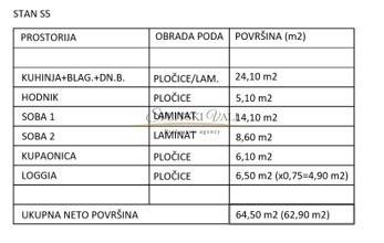 Na prodaju novi stambeni projekt s ukupno osam stanova, smješten u mirnom dijelu Kaštel Novog. Projekt se izvodi prema suvremenim standardima i provjerenim materijalima. Stan S5 nalazi se na prvom katu te se sastoji od ulaznog prostora, kuhinje s blagovaonicom, dnevnog boravka, dvije spavaće sobe, kupaonice i loggie.