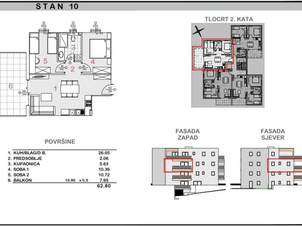 Stan se sastoji od kuhinje, blagovaonice i dnevnog boravka površine 26,06 m2, dvije odvojene spavaće sobe (10,39 m2 i 10,72 m2), kupaonice od 5,63 m2 te predsoblja. Balkon od 15,90 m2 dodatni je kvalitetan vanjski prostor.