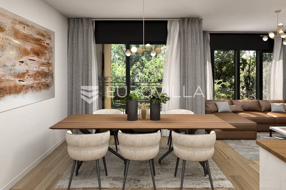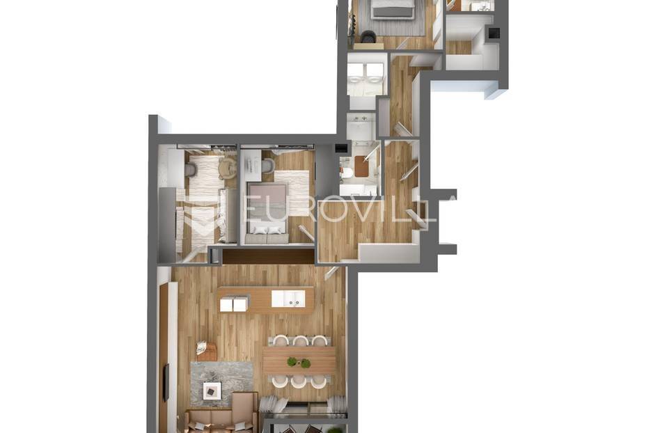 Sastoji se od ulaznog hodnika, open space dnevnog boravka s blagovaonicom i kuhinjom, tri spavaće sobe, dvije kupaonice, gostinjskog toaleta, vešeraja te loggie 6,80 m2 (5,10 m2). Stanu pripadaju dva parkirna mjesta u garaži. Idealna lokacija s pogledom na Katedralu, 5 minuta pješice do Trga Bana Jelačića. U stanu su ugradbeni ormari, kuhinja s aparatima a ostali namještaj može biti po dogovoru, u tom slučaju će cijena biti veća. Ostale informacije na upit.