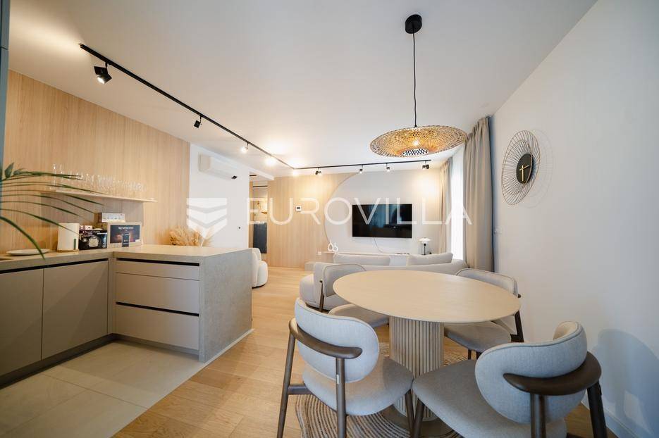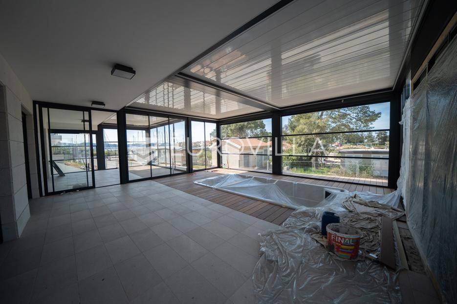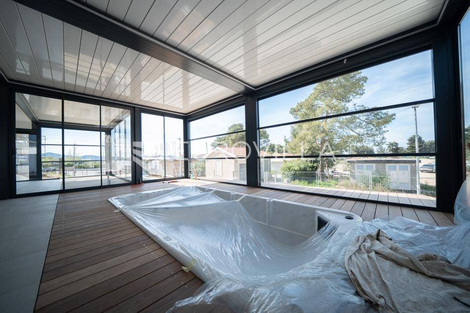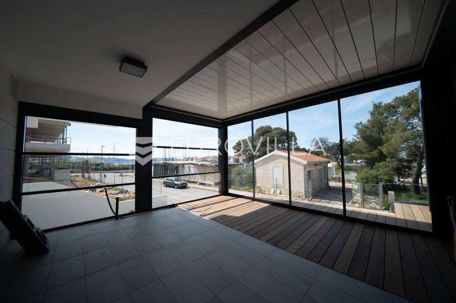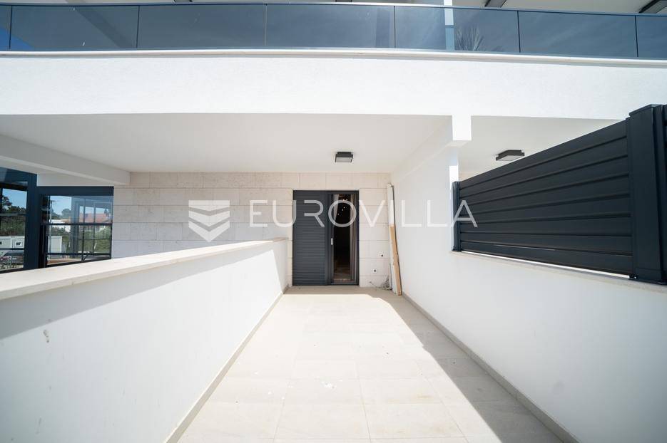 U prestižnom dijelu Zadra - Boriku, poznatom po vrhunskom životnom standardu i blizini mora, nalazi se ovaj izvanredno projektiran stan smješten u prizemlju moderne novogradnje.Lokacija savršeno spaja mirnu stambenu zonu s lako dostupnim sadržajima. Na nekoliko minuta hoda nalaze se uređene plaže, Marine, vrhunski restorani, obalna šetnica, trgovine, kao i osnovna i srednja škola i vrtić - idealno za obiteljski ili luksuzni odmor.Stan je dio nove zgrade s liftom, dizalom od podruma do etaže stana, i pripadaju mu tri vanjska parkirna mjesta i dva garažna parking mjesta.Zgrada je kvalitetne armirano-betonske gradnje, s izvedenom termofasadom (10 cm), modernom ALU stolarijom s troslojnim staklima i električnim roletama.Stan se prostire na 68,72 m² unutarnjeg prostora, a dodatno uključuje:· Dvije nenatkrivene terase površine 11,4 m2 odnosno 7,25 m2· Dvije natkrivene terase površina 11,23 m2 odnosno 24,31 m2· Jedno zatvoreno garažno parking mjesto· Tri vanjska parkirna mjestaUkupna neto korisna površina s pripadcima iznosi 108,44 m².Stan se sastoji od:· Ulaznog prostora· prostrane dnevne zone s kuhinjom i blagovaonicom· dvije spavaće sobe· dvije kupaonice· velike terase natkrivene pergolom i opremljene ljetnom kuhinjom, bazenom i saunom.Tehničke specifikacije stana su: Podno grijanje u unutrašnjosti stana, pametno upravljanje (WIFI), Multi-split klima sustav - hlađenje i grijanje u svim prostorijama (WIFI upravljanje), Troslojna ALU stolarija s komarnicima i električnim roletama, Protuprovalna/protupožarna vrata, podne obloge od prvoklasnog parketa i keramike, lakirana unutarnja vrata bez štoka, moderni sanitarni elementi.Najviši standard gradnje i moderan dizajn za one koji traže samo najbolje.Stan se isporučuje namješten u suradnji s renomiranim dizajnerskim studijem.Kupac je oslobođen plaćanja poreza na promet nekretnina, budući da je vlasnik pravna osoba.
