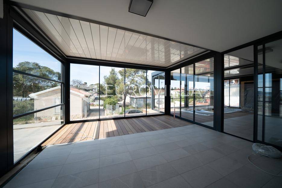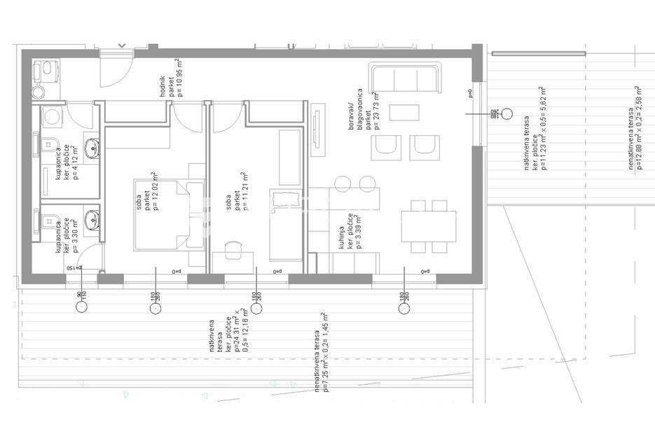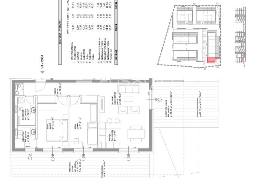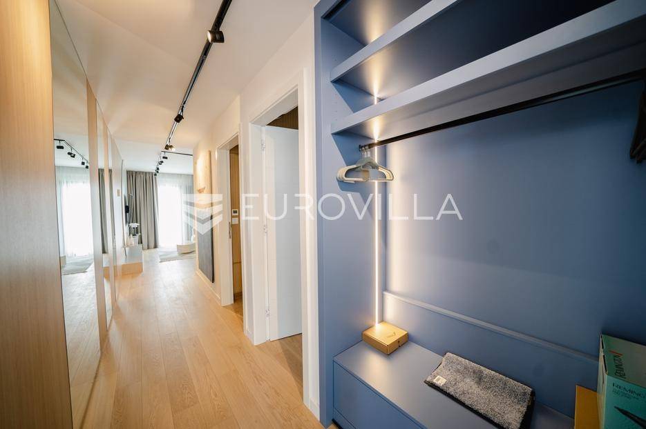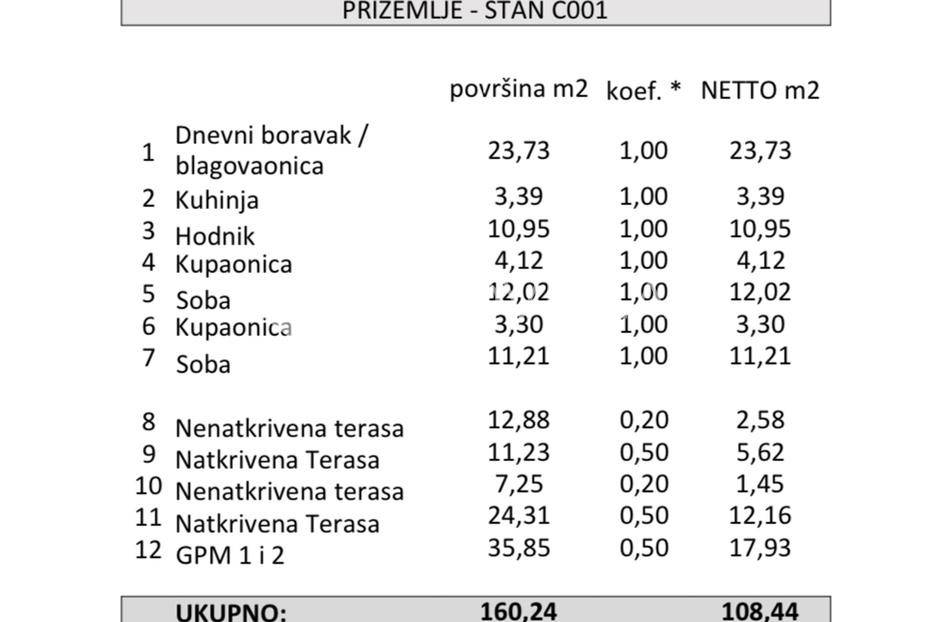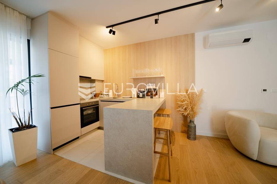 U prestižnom dijelu Zadra - Boriku, poznatom po vrhunskom životnom standardu i blizini mora, nalazi se ovaj izvanredno projektiran stan smješten u prizemlju moderne novogradnje.Lokacija savršeno spaja mirnu stambenu zonu s lako dostupnim sadržajima. Na nekoliko minuta hoda nalaze se uređene plaže, Marine, vrhunski restorani, obalna šetnica, trgovine, kao i osnovna i srednja škola i vrtić - idealno za obiteljski ili luksuzni odmor.Stan je dio nove zgrade s liftom, dizalom od podruma do etaže stana, i pripadaju mu tri vanjska parkirna mjesta i dva garažna parking mjesta.Zgrada je kvalitetne armirano-betonske gradnje, s izvedenom termofasadom (10 cm), modernom ALU stolarijom s troslojnim staklima i električnim roletama.Stan se prostire na 68,72 m² unutarnjeg prostora, a dodatno uključuje:· Dvije nenatkrivene terase površine 11,4 m2 odnosno 7,25 m2· Dvije natkrivene terase površina 11,23 m2 odnosno 24,31 m2· Jedno zatvoreno garažno parking mjesto· Tri vanjska parkirna mjestaUkupna neto korisna površina s pripadcima iznosi 108,44 m².Stan se sastoji od:· Ulaznog prostora· prostrane dnevne zone s kuhinjom i blagovaonicom· dvije spavaće sobe· dvije kupaonice· velike terase natkrivene pergolom i opremljene ljetnom kuhinjom, bazenom i saunom.Tehničke specifikacije stana su: Podno grijanje u unutrašnjosti stana, pametno upravljanje (WIFI), Multi-split klima sustav - hlađenje i grijanje u svim prostorijama (WIFI upravljanje), Troslojna ALU stolarija s komarnicima i električnim roletama, Protuprovalna/protupožarna vrata, podne obloge od prvoklasnog parketa i keramike, lakirana unutarnja vrata bez štoka, moderni sanitarni elementi.Najviši standard gradnje i moderan dizajn za one koji traže samo najbolje.Stan se isporučuje namješten u suradnji s renomiranim dizajnerskim studijem.Kupac je oslobođen plaćanja poreza na promet nekretnina, budući da je vlasnik pravna osoba.