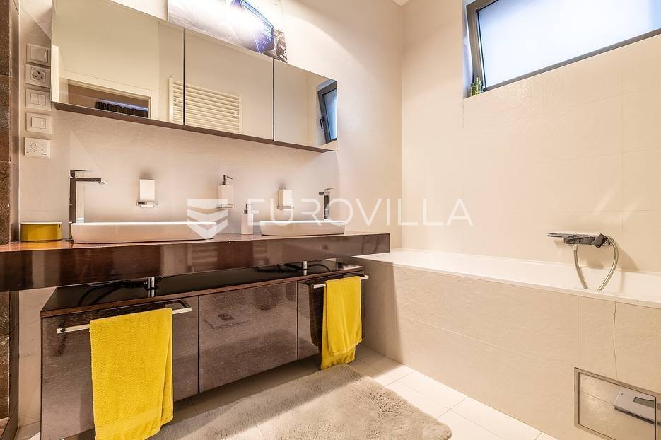 Sveti Duh, prekrasno uređen i luksuzno namješten trosoban stan površine 122 m2 na 2. katu novogradnje s liftom. Sastoji se od ulaznog hodnika, prostranog dnevnog boravka s blagovaonicom, potpuno opremljene kuhinje, spavaće sobe s vlastitom kupaonicom (kada i tuš kabina), druge spavaće sobe, kupaonice s tušem, vešeraja te loggie (17,25 m2). Grijanje etažno plinsko, klimatizirano. Pripadajuća 2 parkirna mjesta ispred zgrade.Odlična lokacija u mirnoj ulici, u blizini javnog prijevoza, trgovina te svih potrebnih sadržaja.Ostale informacije na upit.