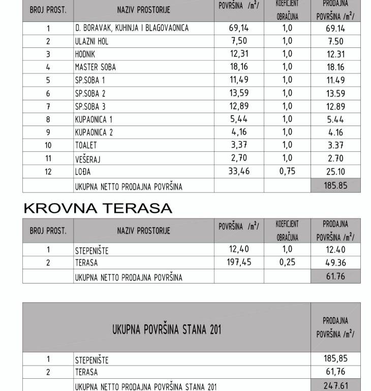 Stan B-S201 - 2. kat + krovna terasa - stambena površina 161,58 m2 (4 spavaće sobe + 2 kupaonice) + lođa (34 m2) + krovna terasa (198 m2), neto obračunske površine 249,10 m2 = 1.090.000 EUR
