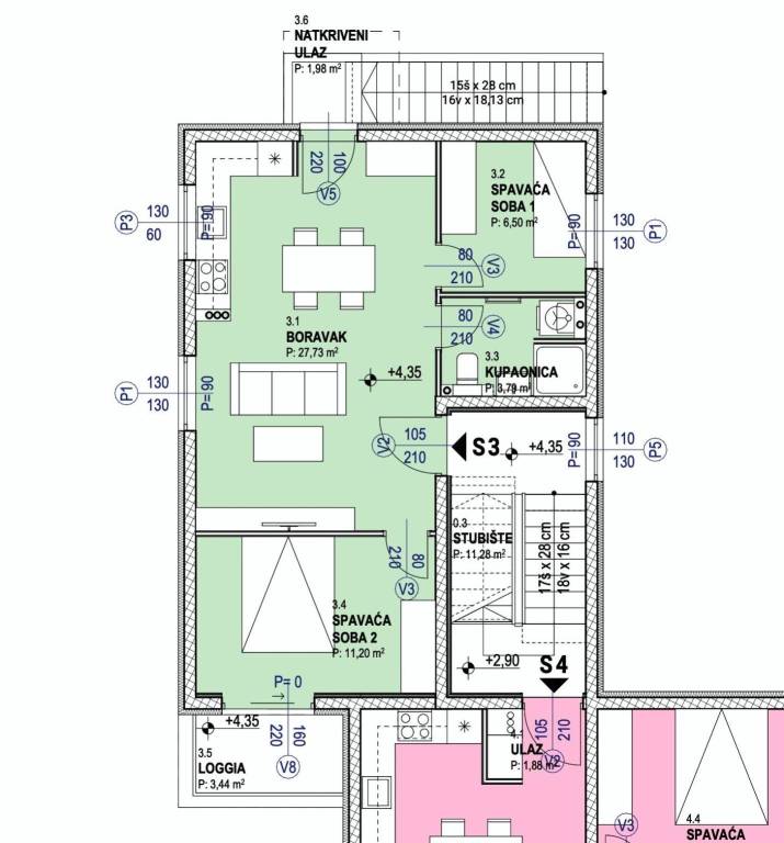 Stan S3 - 1. kat - stambena površina 49,22 m2 (2 spavaće sobe + kupaonica) + lodja (3,44 m2) + dvorište i terasa u prizemlju s vanjskim bazenom 3x7m (72,67 m2) + vanjsko parking mjesto PM3, ukupna neto površina 66,08 m2 = 270.000 EUR (cijena s uključenim PDV-om)