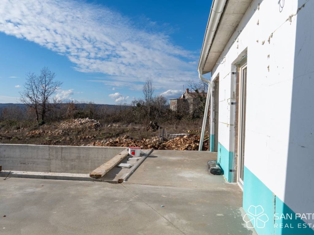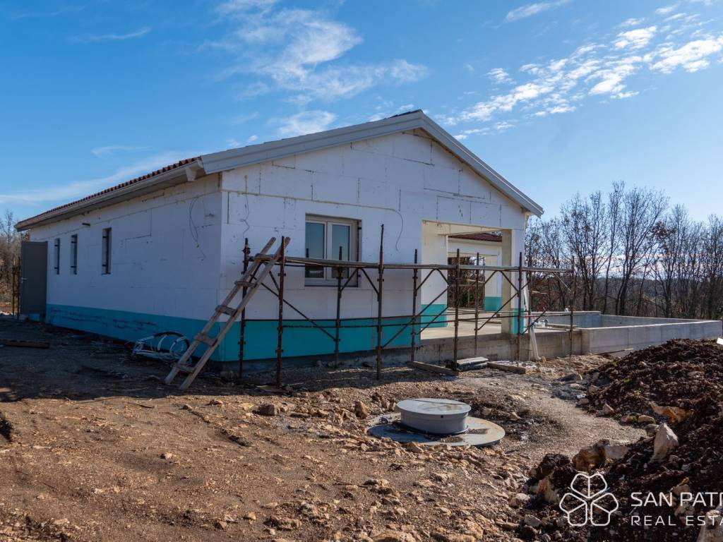 Na prodaju je moderna prizemnica, trenutno u završetku izgradnje, smještena na mirnoj lokaciji, 15 minuta vožnje od centra Labina. Okružena prirodom, maslinicima i obiteljskim kućama, ova nekretnina pruža privatnost i opuštajući ambijent daleko od gradske vreve.