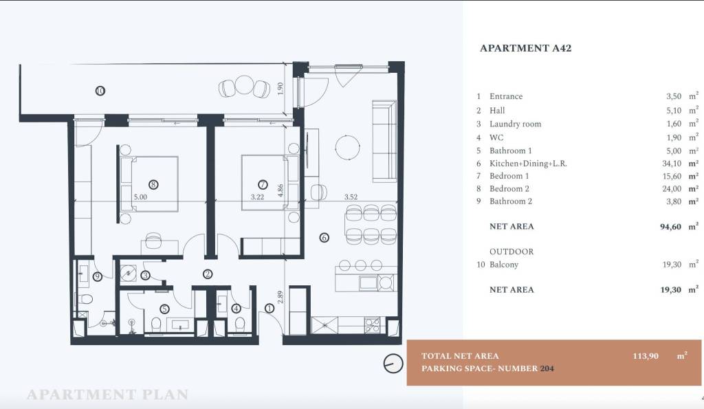 Apartman A-42 – 3. kat – stambena površina 94,60 m2 (2 spavaće sobe + 2 kupaonice + wc) + balkon (19,30 m2 - pogled more) + vanjsko parking mjesto broj 204, obračunska neto površina 112,07 = 1.007.497,00 EUR (s uključenim namještajem)