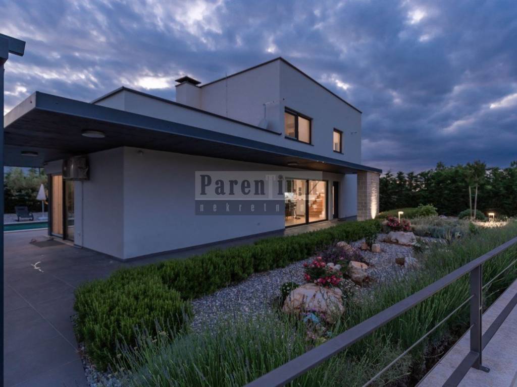 Vila moderne arhitekture u mirnom djelu naselja. Sadrži : SUTEREN : konobu za druženja, kupaonu, prostoriju za saunu, teretanu i jacuzzi, i praonicu rublja. PRIZEMLJE : otvoreni i osvijetljen prostor gdje se nalazi kuhinja s blagovaonicom i dnevni boravak s izlazom na terasu i dvorište, hodnik, kupaonica, dvije spavaće sobe s vlastitom kupaonom i garderobom . 1.KAT : dvije spavaće sobe , kupaonica i terasa.