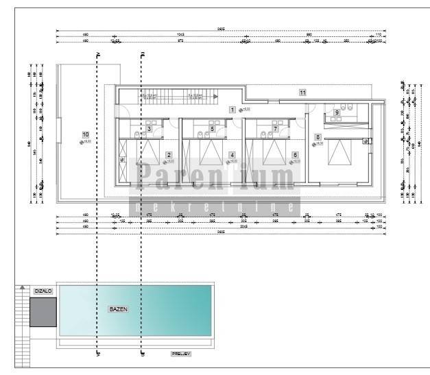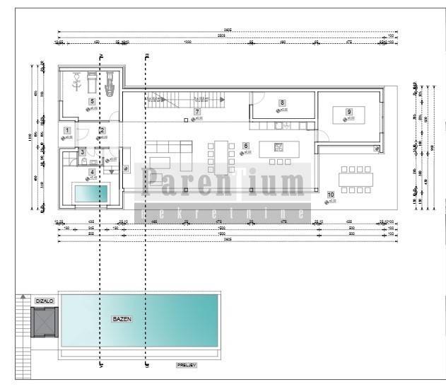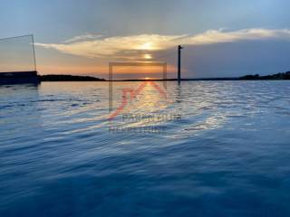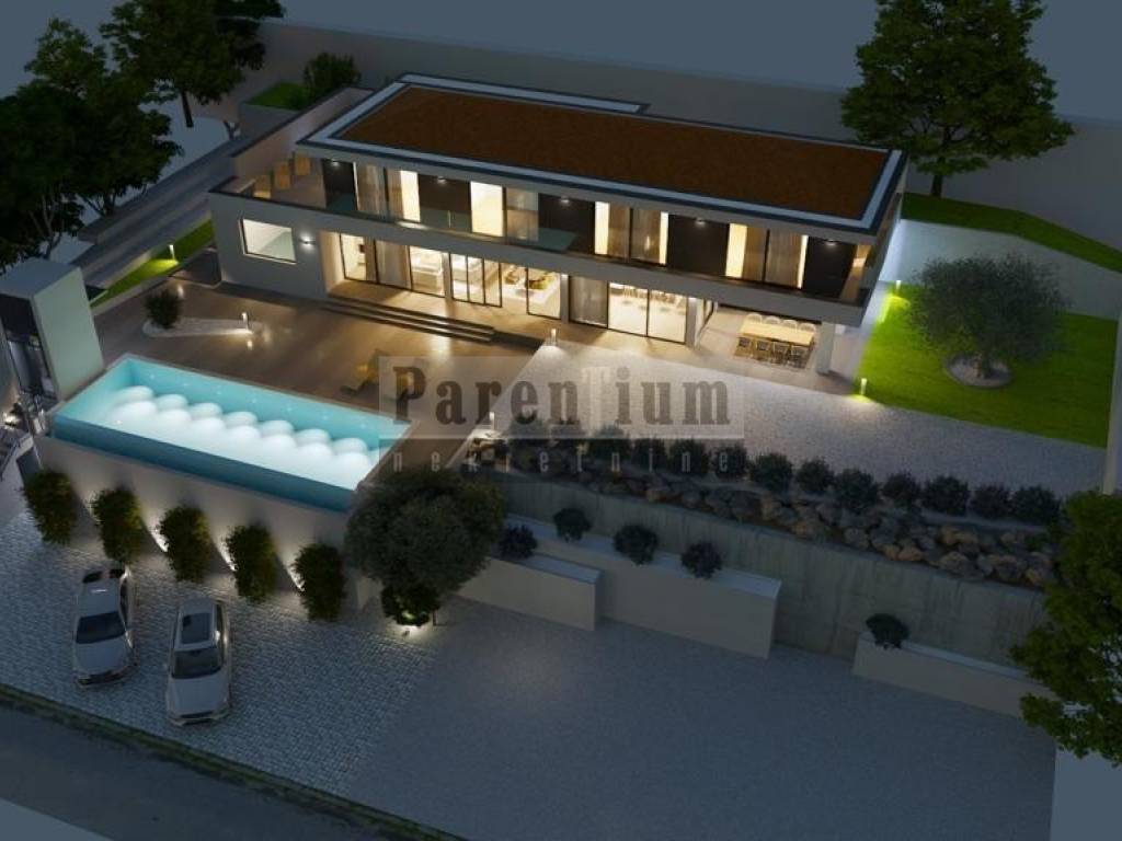 Kuća suvremene arhitekture nalazi se na građevinskom zemljištu od 1 094 m2. Parcela je potpuno komunalno uređena. Kuća jetlocrtne veličine 26x11 metara u prizemlju, infinity bazen 12x4 m korisne vodene površine. Ispod bazena strojarnica i ostava od 20 m2. Posebnost ove građevine čini dizalo koje služi zasvladavanje visinske razlike od ceste do ulaza u kuću od 7 metara. Ispred bazena je popločeno sunčalište od 100 m2. Kuća je ukupne neto stambene površine 419 m2. U prizemlju centralnog dijela nalazi se veliki otvoreni prostor dnevnog boravka s kaminom i kuhinja, ostakljen kliznim stijenama. Uz to u prizemlju se nalazi prostorija sa saunom s gostinjskim WC-om. Jedna prostorija namijenjena je za teretanu, te kuća ima jedan polivalentni prostor koji je namijenjen za kino dvoranu ili vinoteku/ igraonicu. U vanjskom dijelu nalazi se vanjska ljetna kuhinja s roštiljem. Na katu su četiri spavaće sobe s vlastitim kupaonicama. Svaka spavaća soba ima veliku kliznu stijenu za uživanje u jedinstvenom pogledu, te izlaz na zajedničku terasu. Karakteristike nekretnine: - neto stambena površina 419m2 - četiri parkirna mjesta, jedno mjesto za punjenje e- automobila - vanjski infinity bazen 48m2 - vanjsko stakleno dizalo 7m podizne visine - aluminijska stolarija, antracit boje, podizno klizne stijene - podno grijanje u svim prostorijama uz toplinsku pumpu, sa zasebnim termostatom u svakoj prostoriji - klima jedinice u svim prostorijama - rekuperator topline u cijeloj kući - jacuzzi na vanjskoj terasi i sauna - objekt projektiran za pet zvjezdica i A+ certifikat
