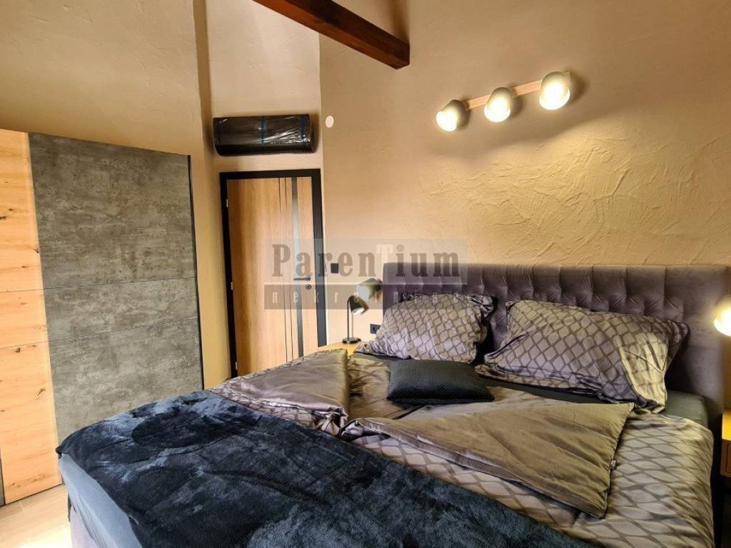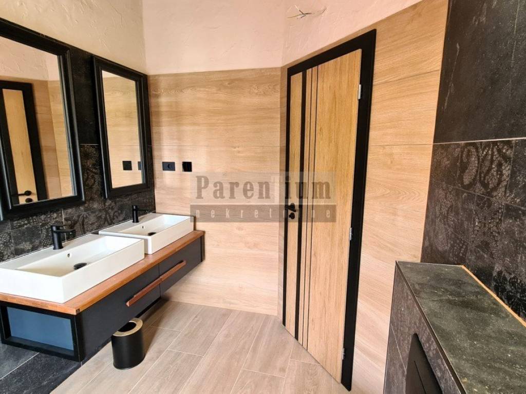 Prizemlje kuće sastoji se od predivnog dnevnog boravka sa kaminom te izlazom na zatvorenu terasu - zimski vrt i uređeno dvorište, kuhinje sa blagovaonom te toaleta, dok se kat kuće sastoji od tri spavaće sobe, svaka sa klima uređajem te centralnim kupatilom.