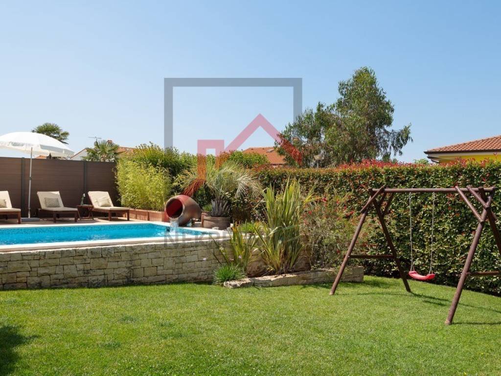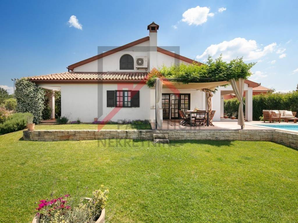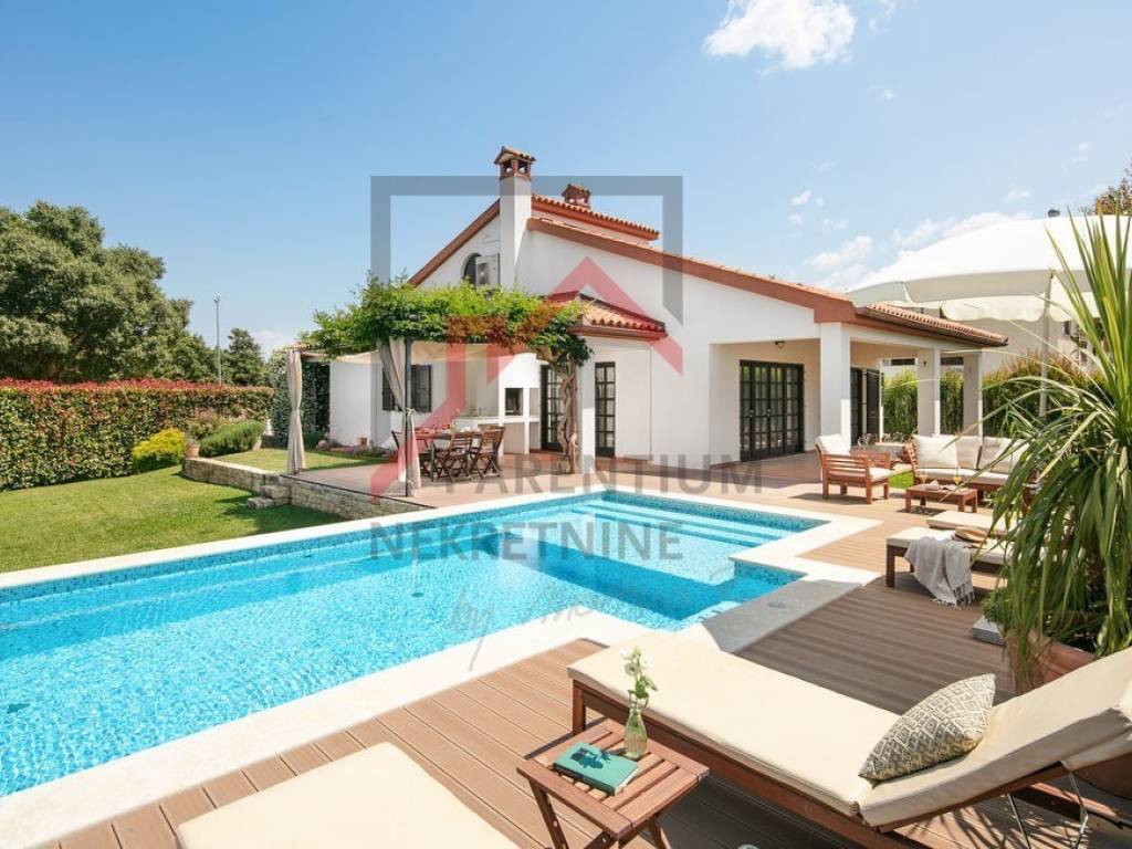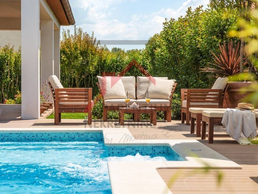 Ovo prekrasno imanje u neposrednoj blizini Poreča nudi savršen spoj luksuza, privatnosti i udobnosti, smješteno na prostranom zemljištu od 780 m s pažljivo uređenom okućnicom. Uživajte u vlastitom bazenu, prostranom sunčalištu i ljetnoj kuhinji, dok natkrivena terasa koja okružuje kuću pruža idiličan prostor za opuštanje i druženje na otvorenom.