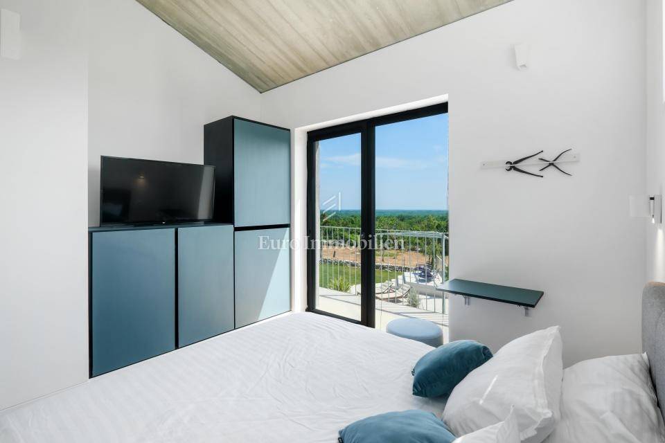 U prizemlju je smješten open space dnevni boravak, kuhinja i blagovaonica iz kojih se pristupa okućnici s bazenom, vanjskom kuhinjom i blagovaonicom na otvorenom. Na katu su tri spavaće sobe, svaka s vlastitom kupaonicom.
