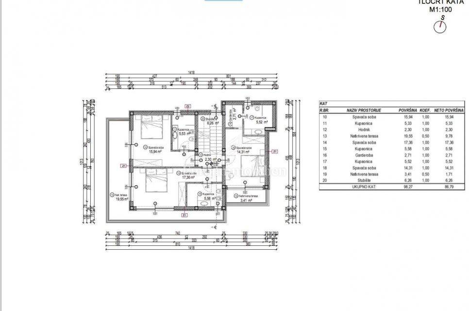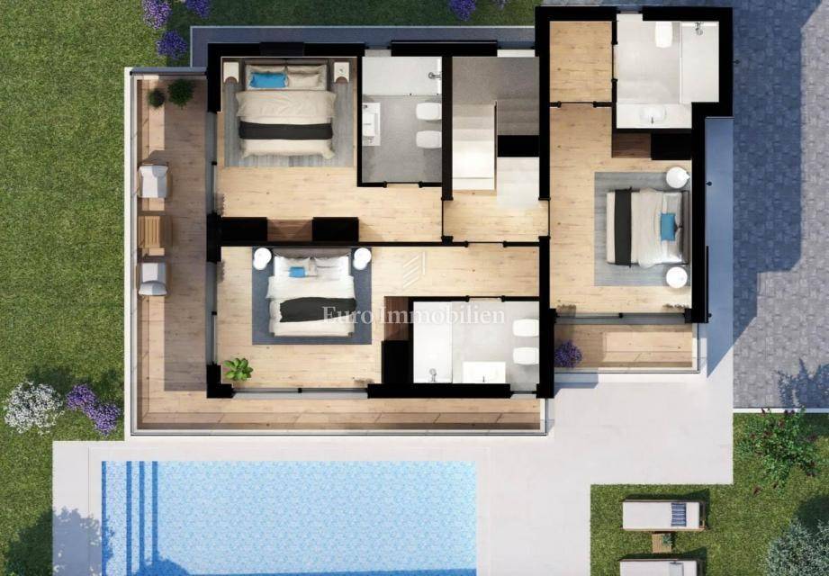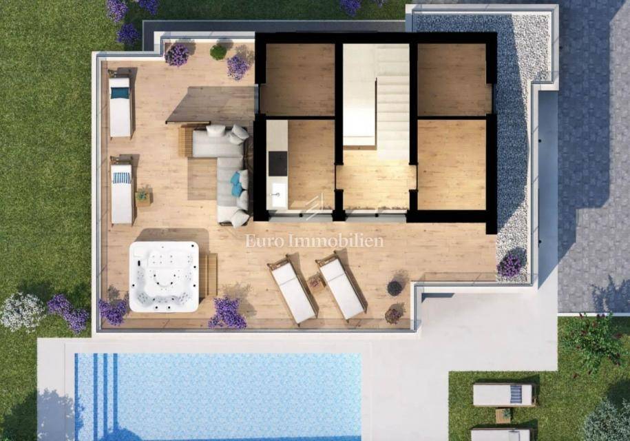 Kuća se sastoji od prizemlja, kata i potkrovlja. Kroz glavni ulaz u kuću ulazi se u prizemlje s dnevnim boravkom, blagovaonskim prostorom, kuhinjom sve u otvorenom konceptu s izlazom na natkrivenu terasu i okućnicu. U prizemlju se još nalazi wellness, WC, tehnička soba i spremište. Na prvom katu su 3 spavaće sobe i 3 kupaonice. Svaka spavaća soba ima izlaz na natkrivenu terasu. U potkrovlju je sauna, kupaonica, 2 spremišta te prostrana nenatkrivena terasu s pogledom na more. Grijanje i hlađenje osigurano je podnim grijanjem, kao i klima uređajima.