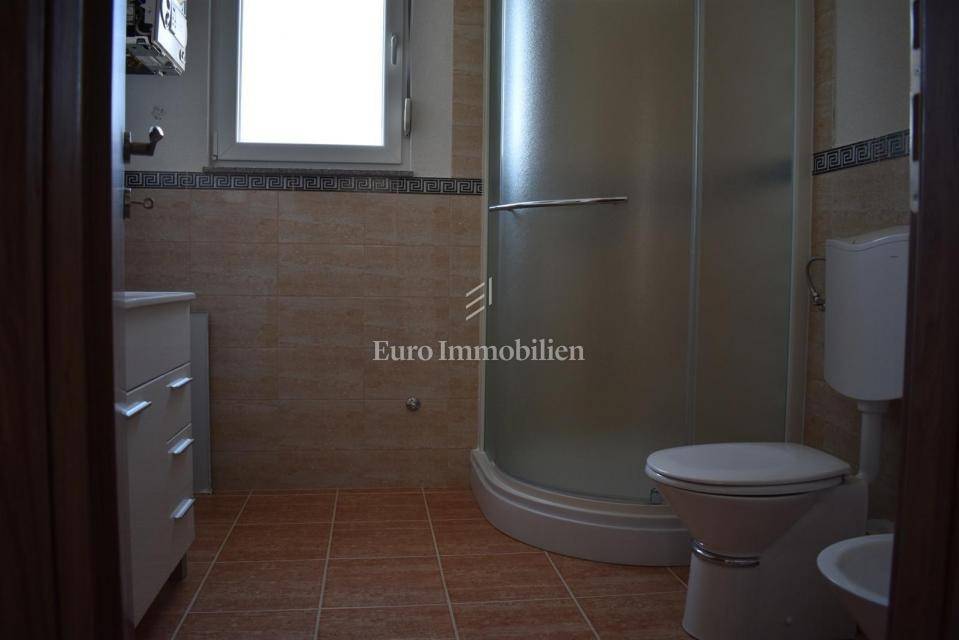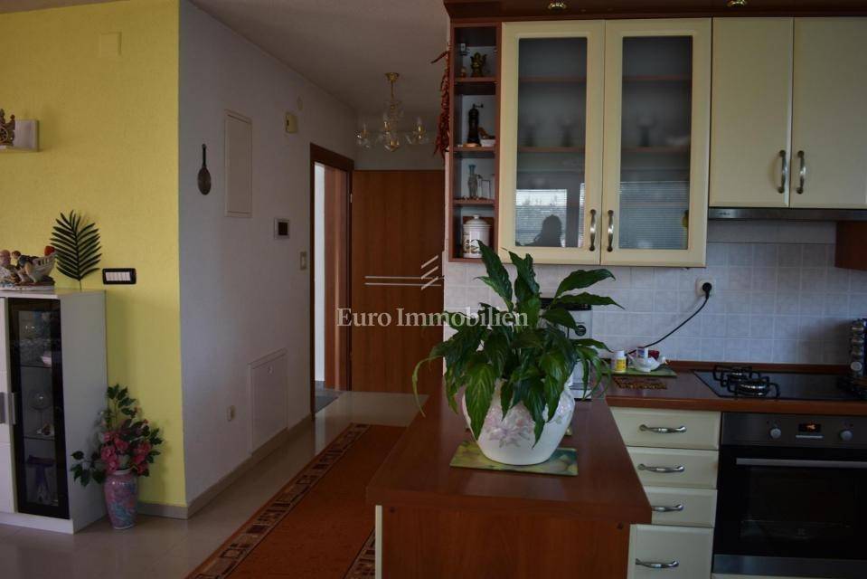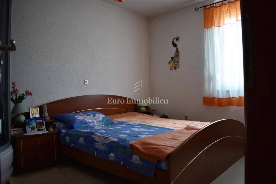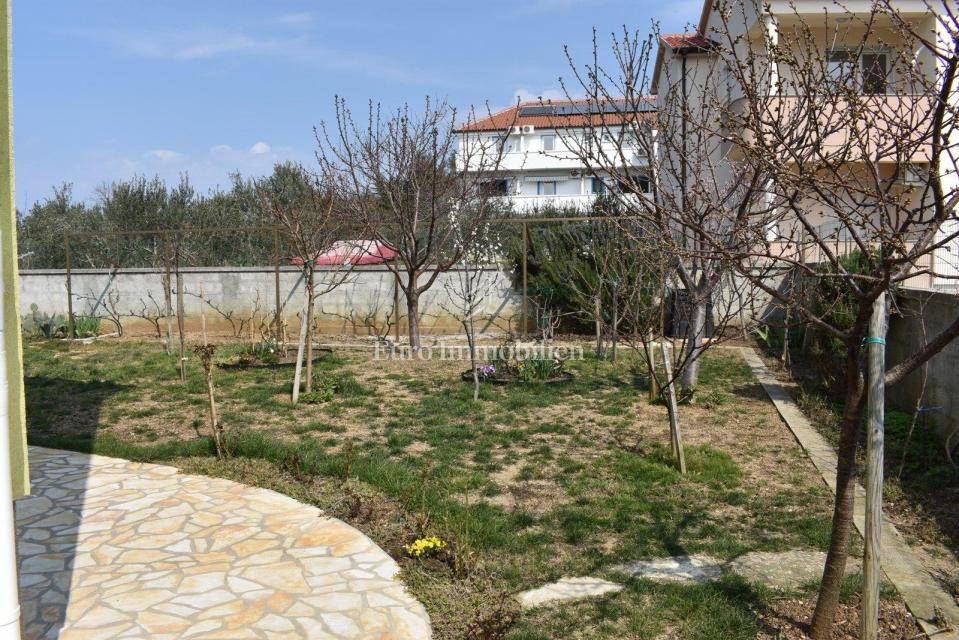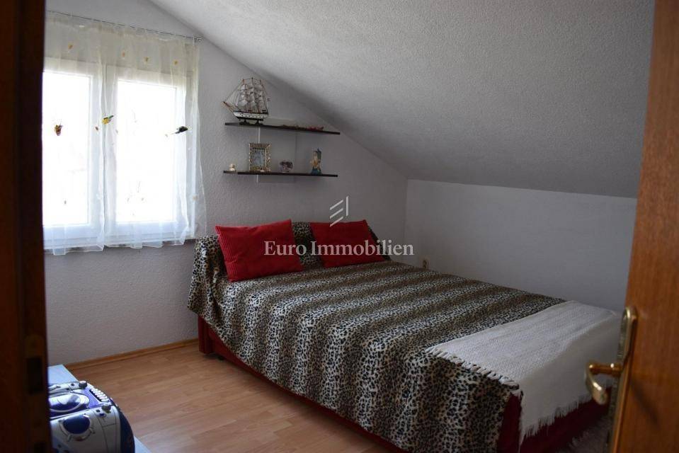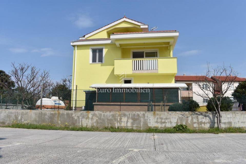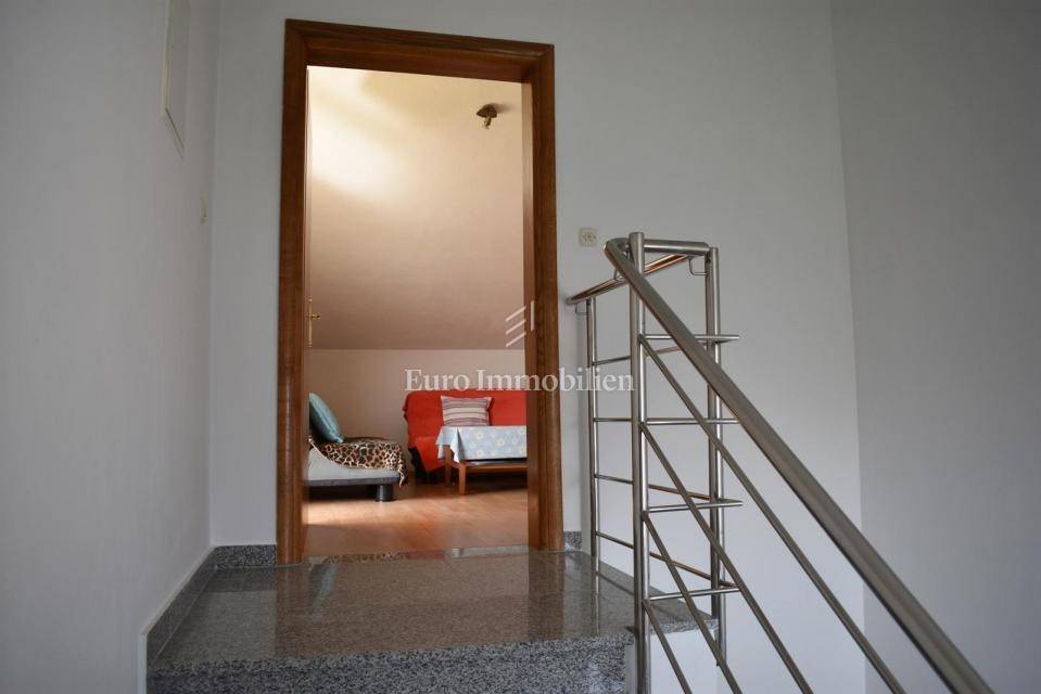 Samostojeća kuća sa tri apartmana na lijepoj lokaciji, udaljena 150 m od mora. Kuća je izgrađena na parceli od 495 m2, proteže se na tri etaže i ima lijepi pogled na more. U prizemlju s nalazi dvosobni apartman, na prvom katu se nalazi trosobni apartman, a u visokom potkrovlju se nalazi dvosobni apartman. Kroz cijelu kuću je provedeno centralno grijanje.