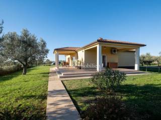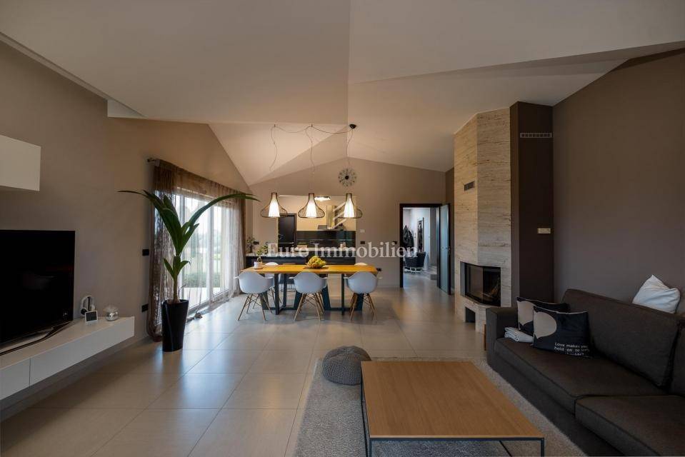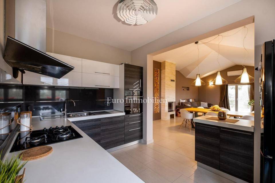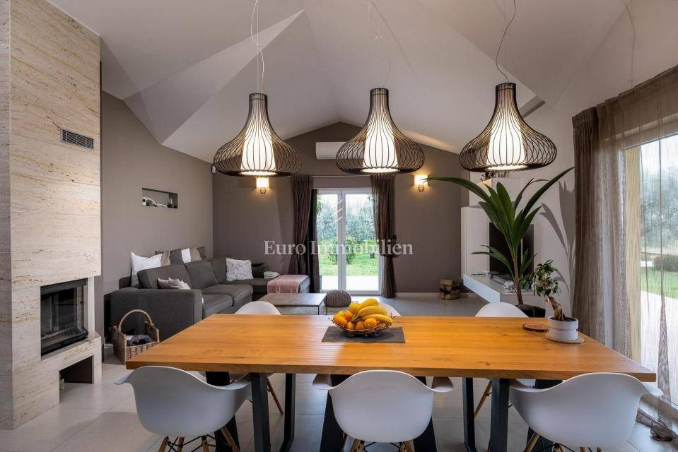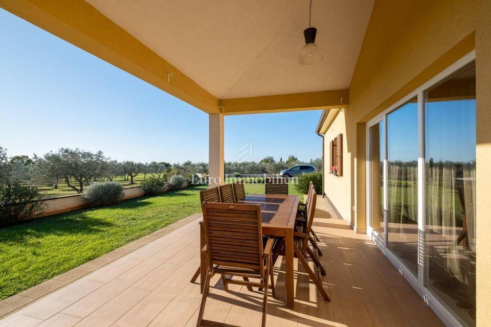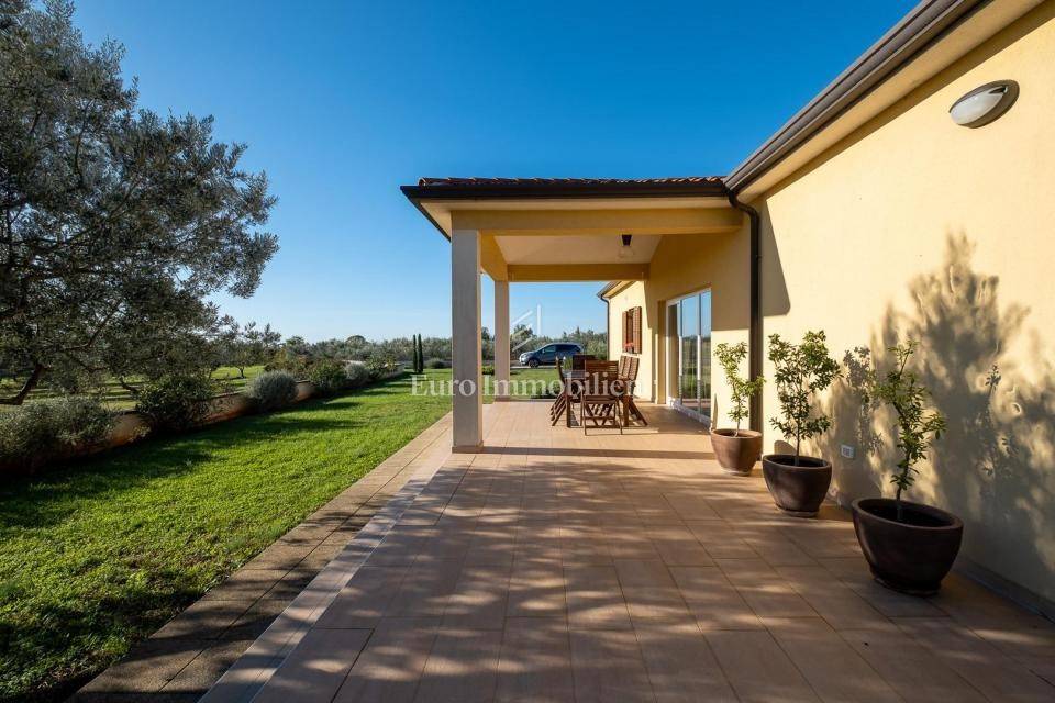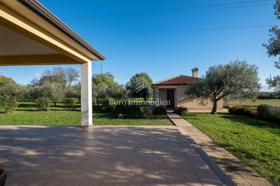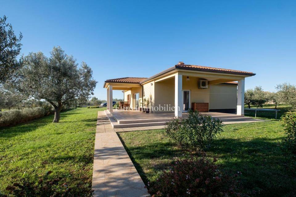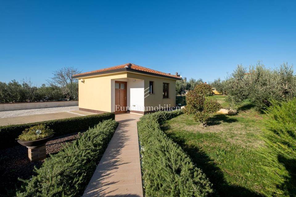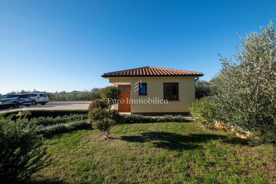 Prodaje se lijepa moderna prizemnica nedaleko od Pule. Odlična lokacija u okruženju maslinika s pogledom na more u daljini. Nalazi se na velikoj parceli od 1831m2 što osigurava mir i tišinu. Na parceli se nalaze 3 objekta - kuća, gostinjska kuća i treći objekt zamišljen kao spremište ili radni prostor - privatni home office!