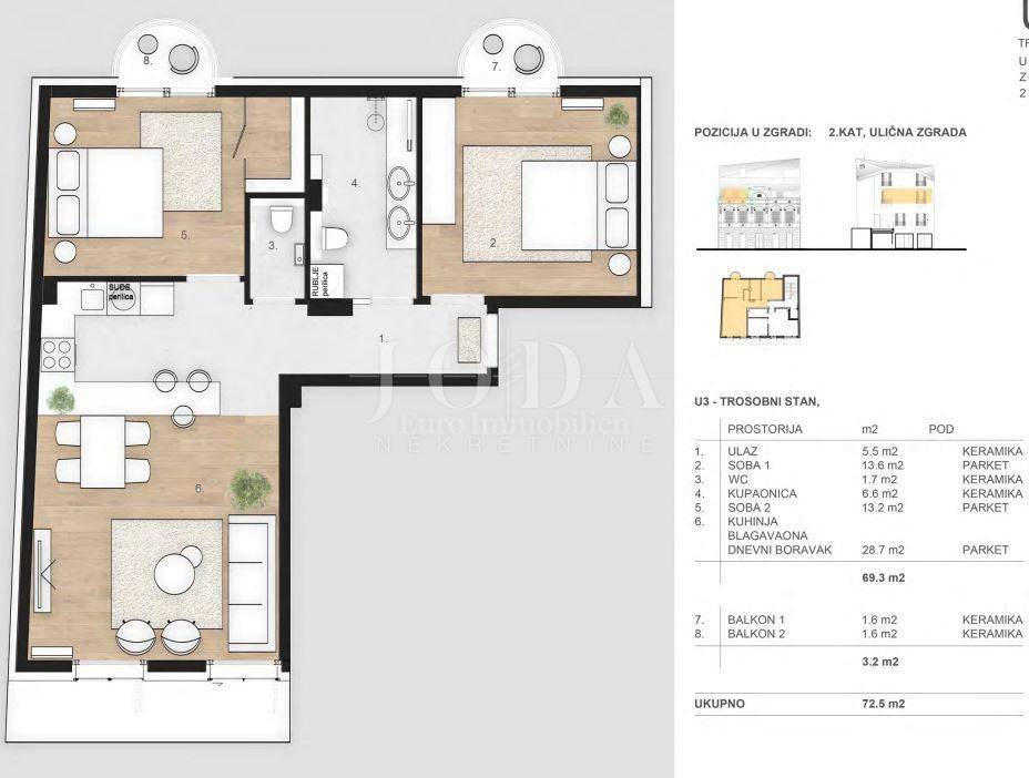 Prodaje se stan koji se nalazi na drugom katu, a sastoji se od prostrane kupaone i spavaćih soba te open space dnevnoga dijela kojega čine kuhinja s blagovaonicom i dnevni boravak.