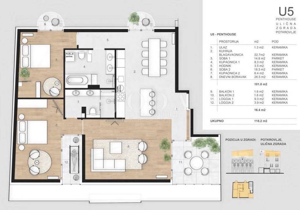 Prodaje se stan koji se nalazi na trećem katu, a sastoji se od prostranih kupaonica i spavaćih soba te open space dnevnoga dijela kojega čine kuhinja s blagovaonicom i dnevni boravak. Pripada mu i mali balkon i terasa. Stan je površine 112.60m2.