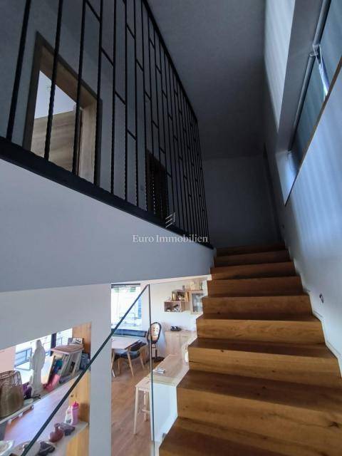 Unutarnjim stepenicama dolazi se na kat gdje su smještene 2 manje spavaće sobe i master soba sa walk in ormarom te kupaona. S gornje etaže je izlaz na stražnji dio kuće gdje se nalazi još jedna terasa, te dodatni vrtni objekt uređen kao konoba za druženje i roštiljanje kao i mali wc. Ispred je još jedna terasa na kojoj se nalazi automatski bazen od 35 m2, sa ugrađenim jacuzzijem i sustavom za protustrujno plivanje. Ispred kuće nalazi se parking za 5 automobila, tri na otvorenome i dva natkrivena parkirna mjesta.