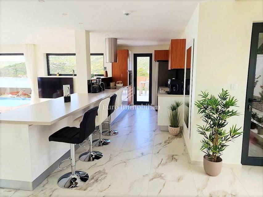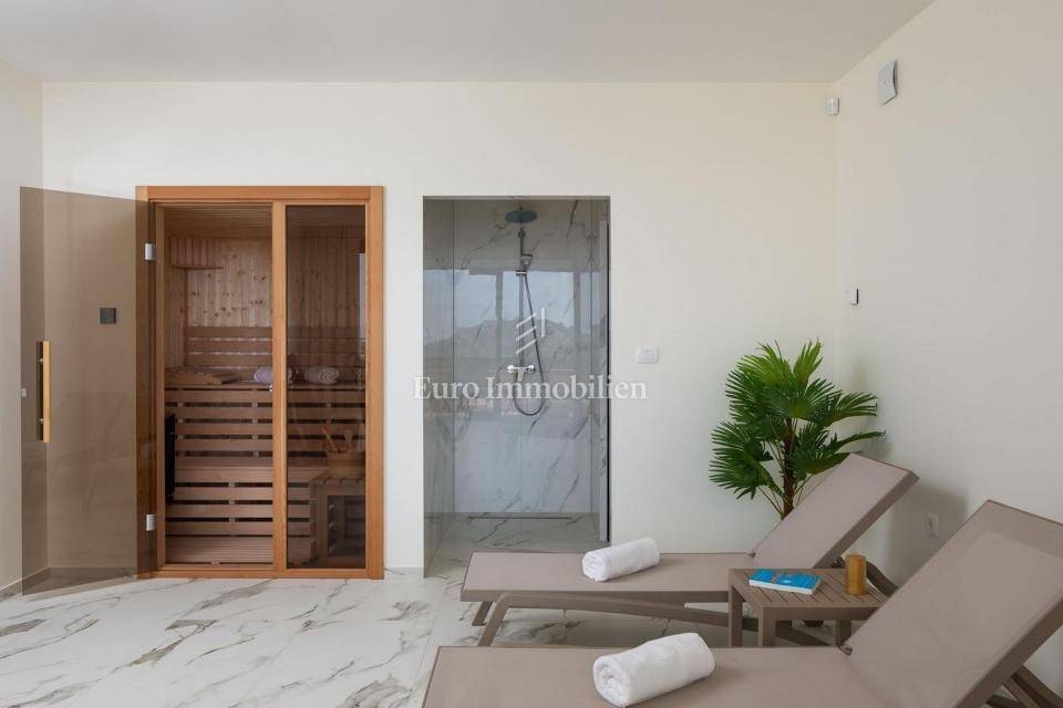Villa je izgrađena 2021. godine i čini kompleks od tri ville. Površina iznosi 260 m2 te se sasoji od dvije etaže - prizemlja i kata. U prizemlju je open space dnevni boravak, kuhinja i blagovaonica, praonica rublja s toaletom te wellness soba sa saunom, kupaonicom i jacuzzijem. Velike staklene stijene povezuju dnevni boravak s terasom. Na terasi se nalazi grijani infinity bazen, sunčalište, vanjski tuš te mjesto za druženje s prijateljima i obitelji. Na prvom katu su četiri spavaće sobe s vlastitim kupaonicama i sve sobe imaju izlaz na terasu. Sa svih etaža se pruža prekrasan pogled na more. Nekretnini pripadaju i tri parkirna mjesta. Villa se prodaje kompletno namještena i opremljena.