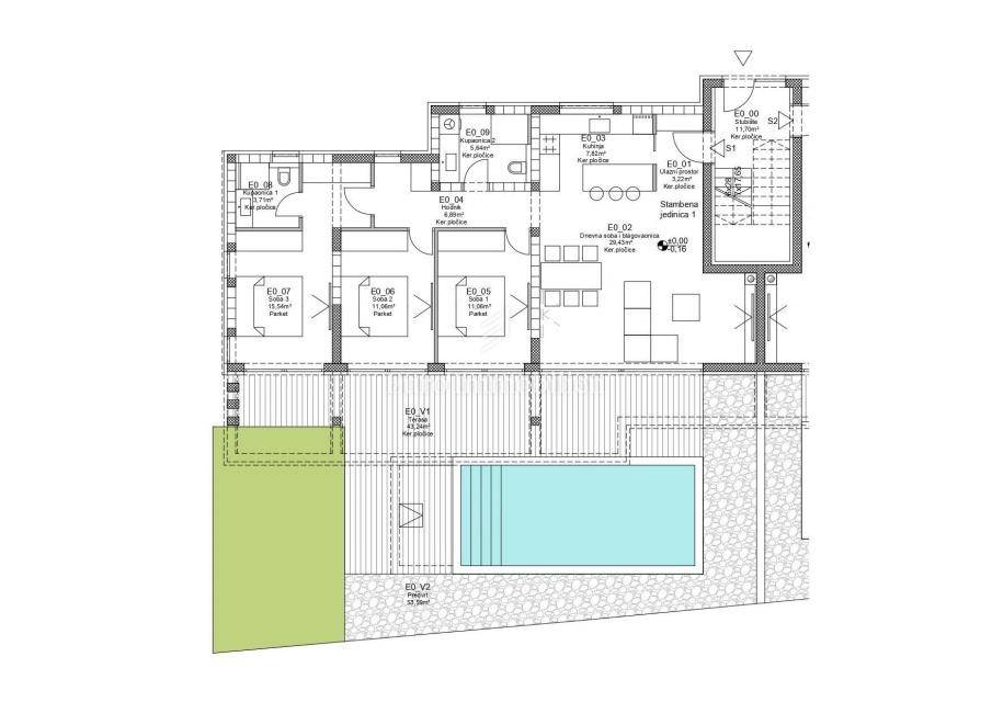 Stan 1 se nalazi u prizemlju i ima 3 spavaće sobe, 2 kupaonice, kuhinju, blagovaonicu i veliki dnevni boravak. Ukupne kvadrature po koeficijentu je 118m2 - 430000€
