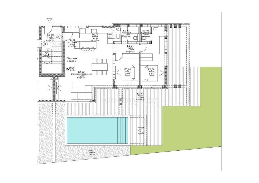 Stan 2 se nalazi u prizemlju i ima 2 spavaće sobe, 2 kupaonice, kuhinju, blagovaonicu i veliki dnevni boravak. Ukupne kvadrature po koeficijentu je 120m2 - 410000€