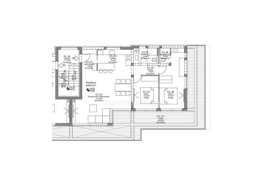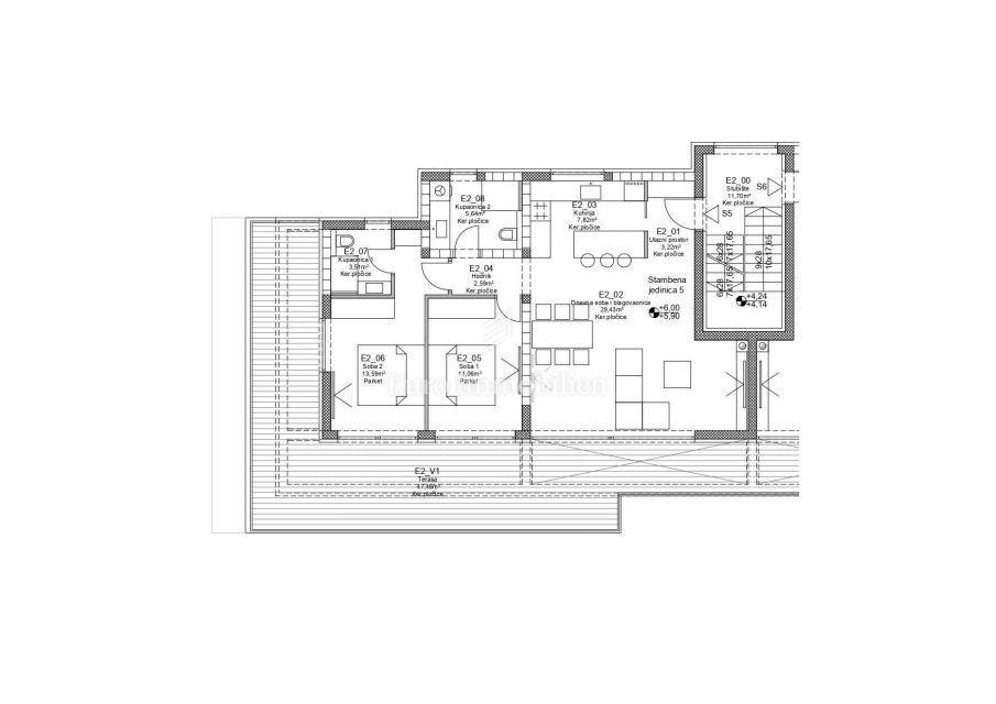 Stan 5 se nalazi na 2. katu i ima 2 spavaće sobe, 2 kupaonice, kuhinju, blagovaonicu i veliki dnevni boravak. Ukupne kvadrature po koeficijentu je 113m2 - 460000€