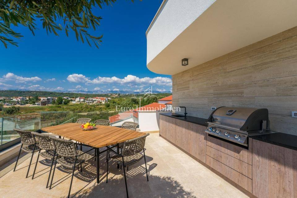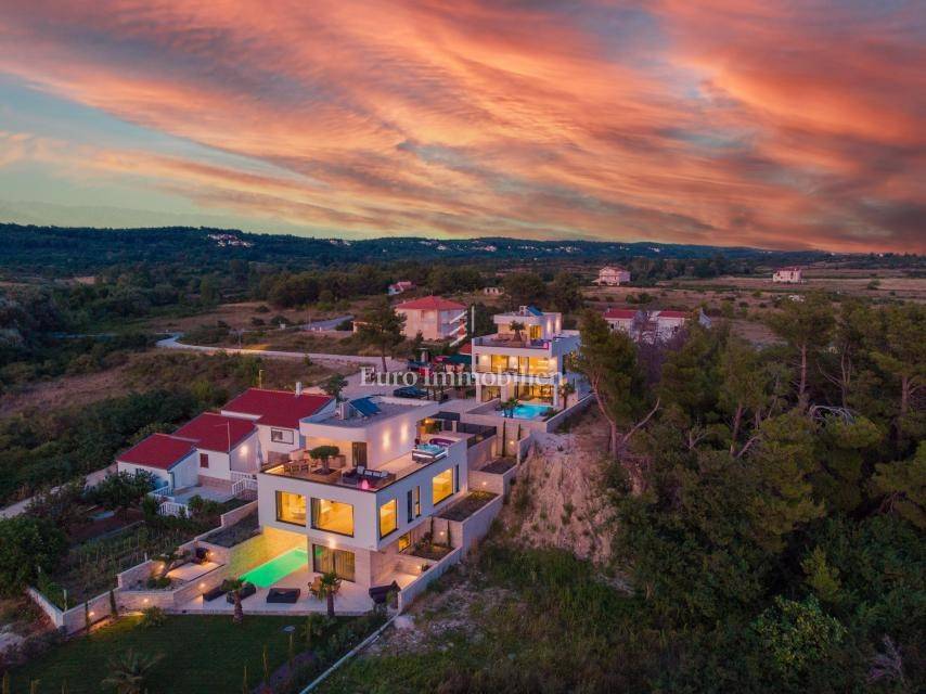 Villa površine 316 m2 Izgrađena je na parceli od 586 m2. Sastoji se od prizemlja, kata i krovne terase. Smještena je na blagoj padini, pa glavni ulaz u villu vodi na krovnu terasu s jacuzzijem i wellness prostorijom sa saunom i teretanom. Na krovnoj terasi, s koje se pruža prekrasan pogled na more, nalazi se i ljetna kuhinja. Na donjoj etaži smještene su tri luksuzno uređene spavaće sobe s kupaonicama. U prizemlju se nalaze prostrani dnevni boravak, kuhinja, blagovaonica, vešeraj i WC. Na terasi se nalazi veliki grijani bazen i lounge prostor. U potpuno ograđenom dvorištu nalaze se vrt i privatno parkiralište. Postoji mogućnost kupnje i garaže sa spremištem.