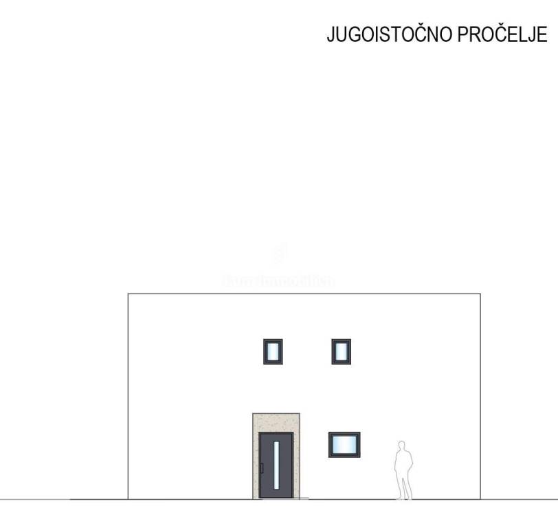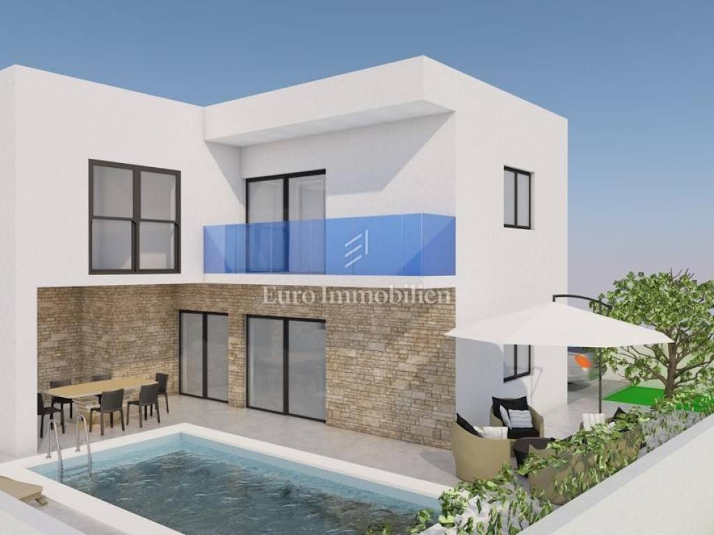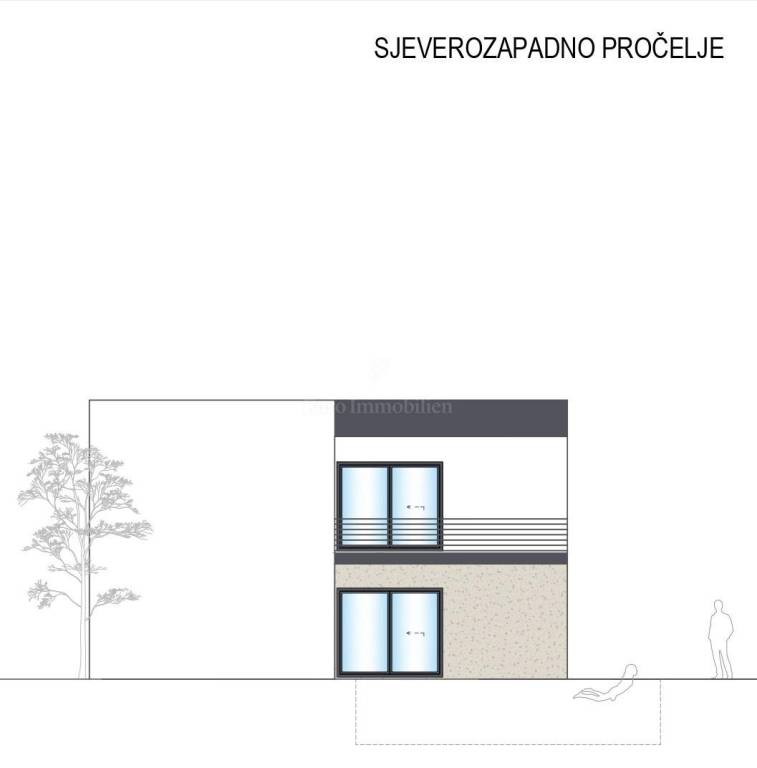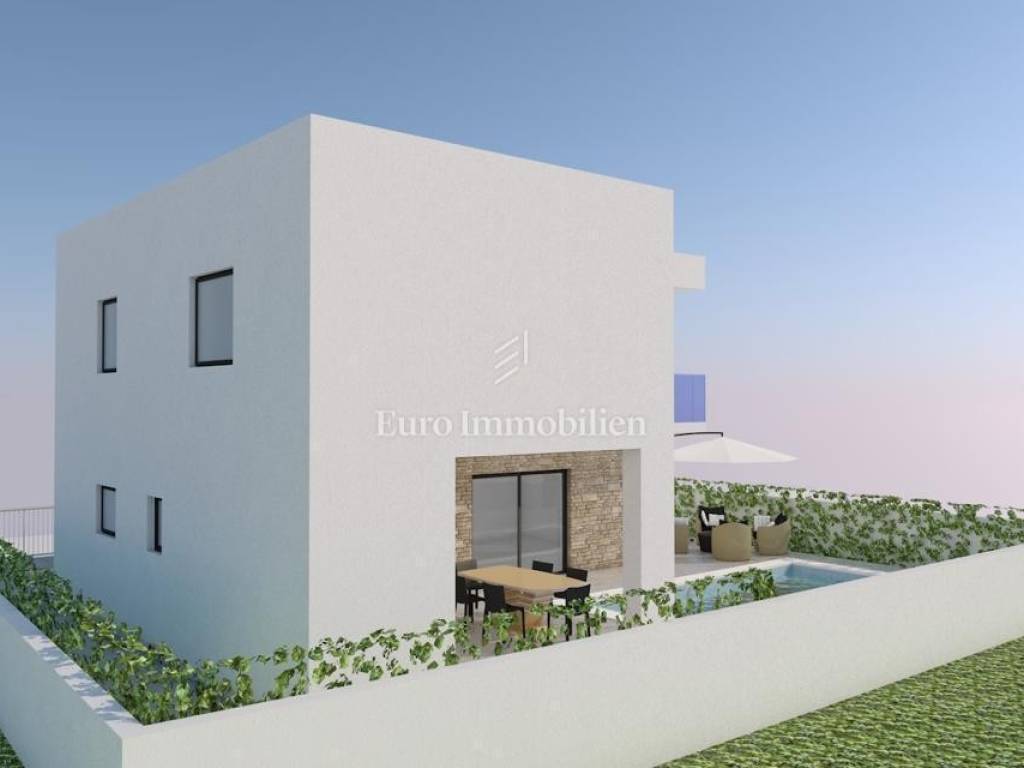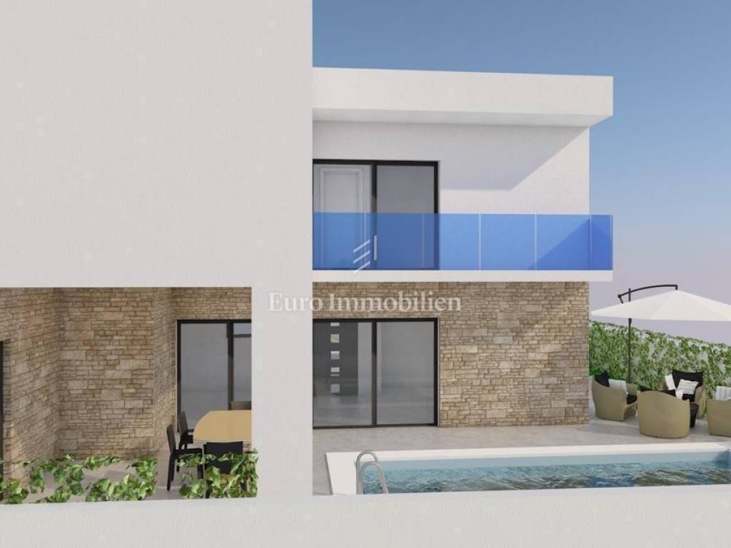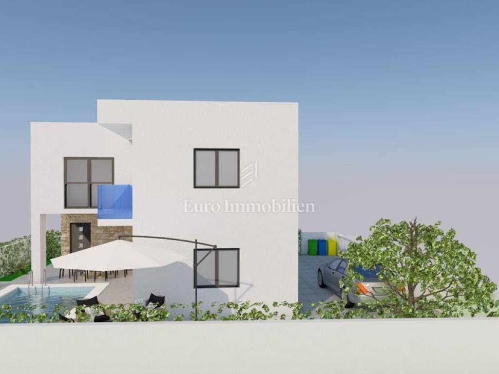 Kuća se proteže na prizemlje i 1. kat. U prizemlju se nalaze spremište, loggia, kupaonica, natkrivena terasa, te kuhinja s blagovaonicom i dnevnim boravkom. Na katu se nalaze tri spavaće sobe, dvije kupaonice, hodnik i natkriveni balkon. Okućnica će biti lijepo uređena i obogaćena maslinama. Pročelje koje gleda na bazen u prizemlju će biti obloženo kamenom travertinom.